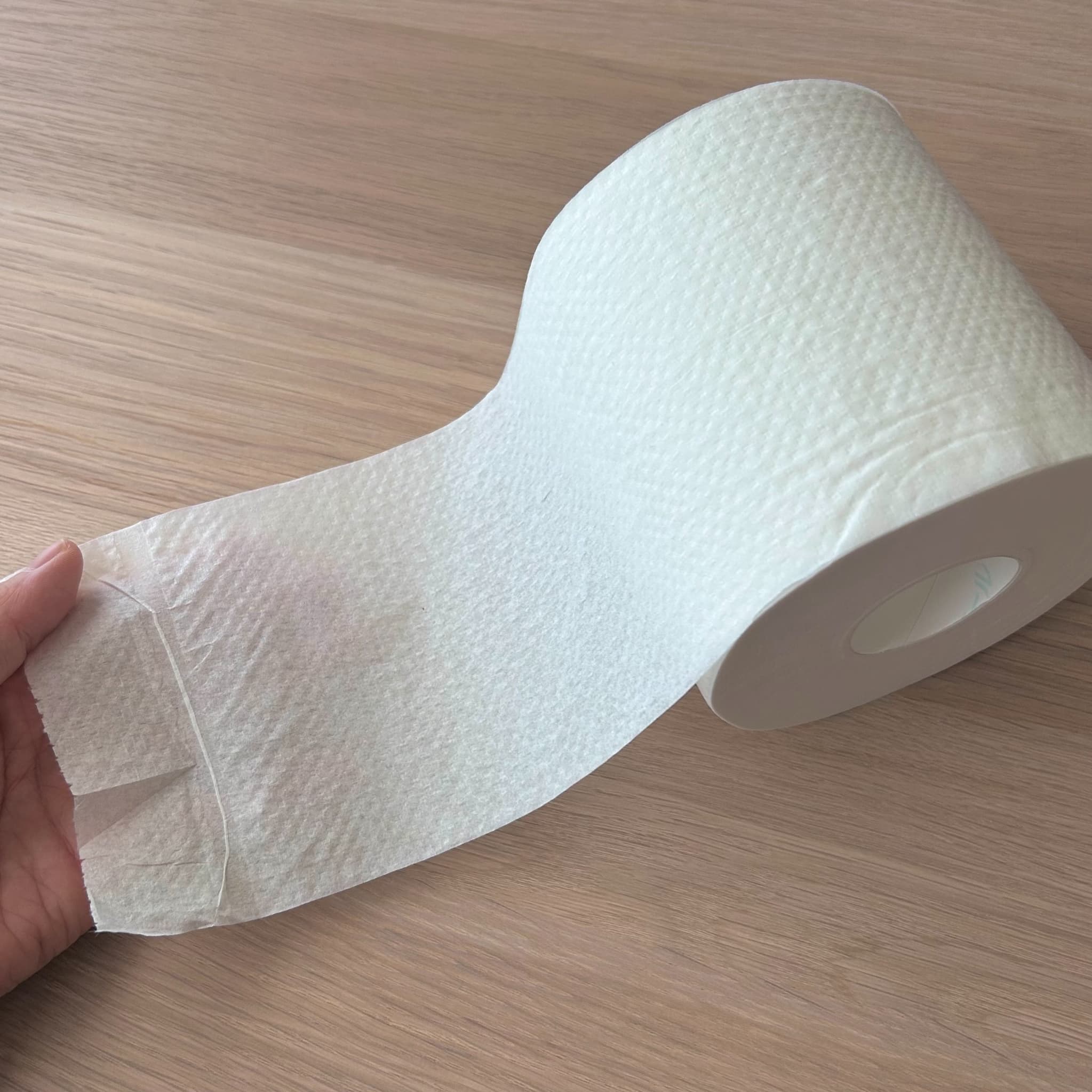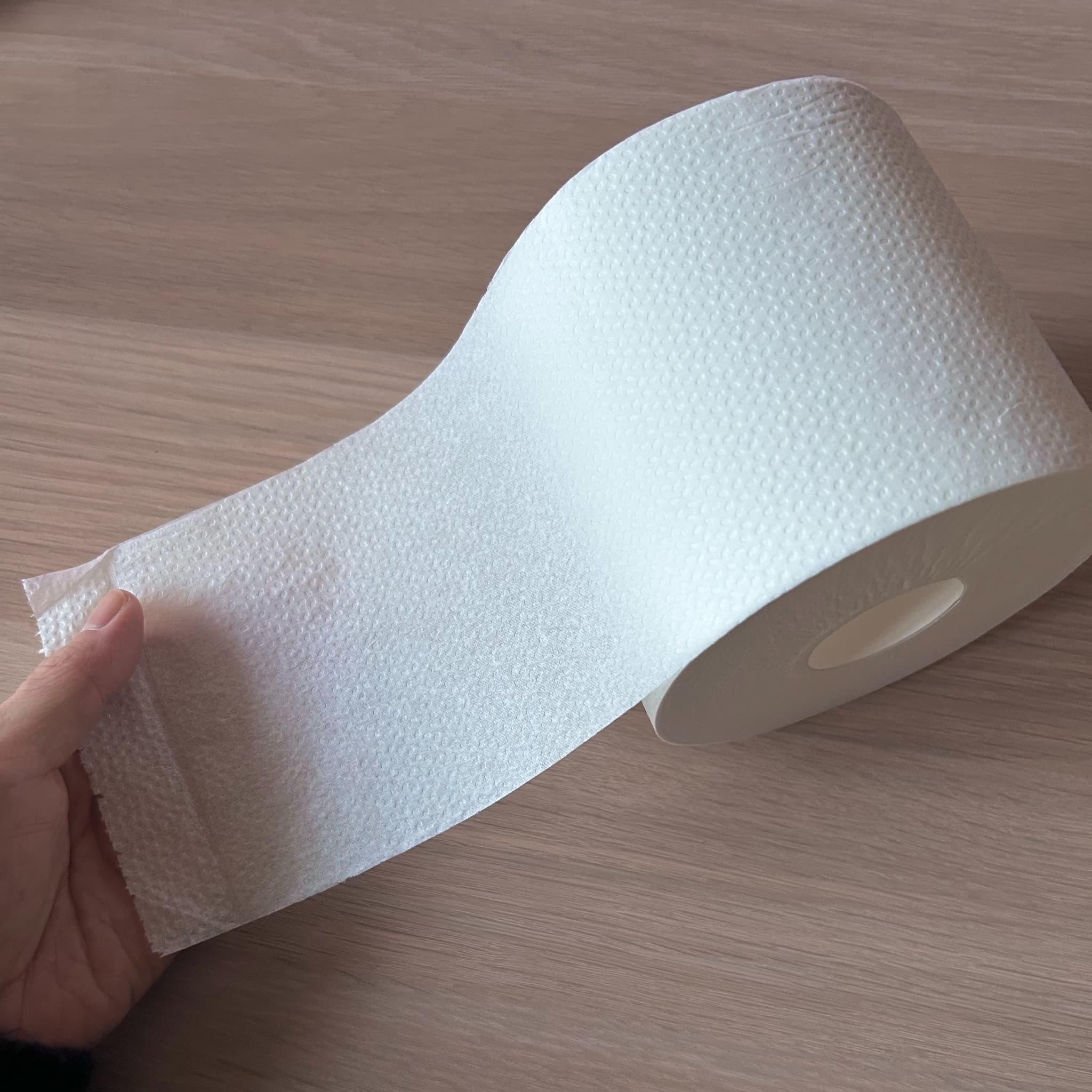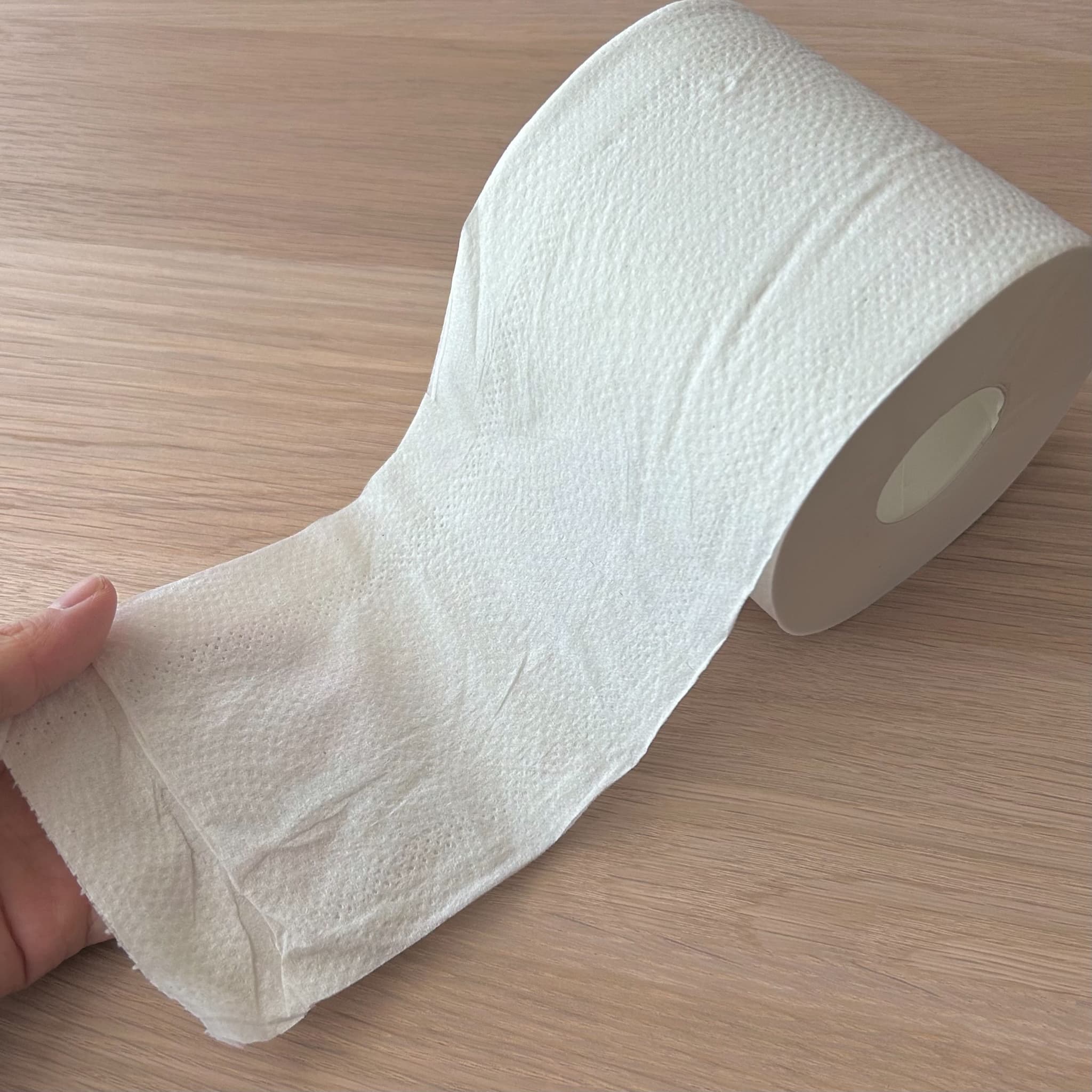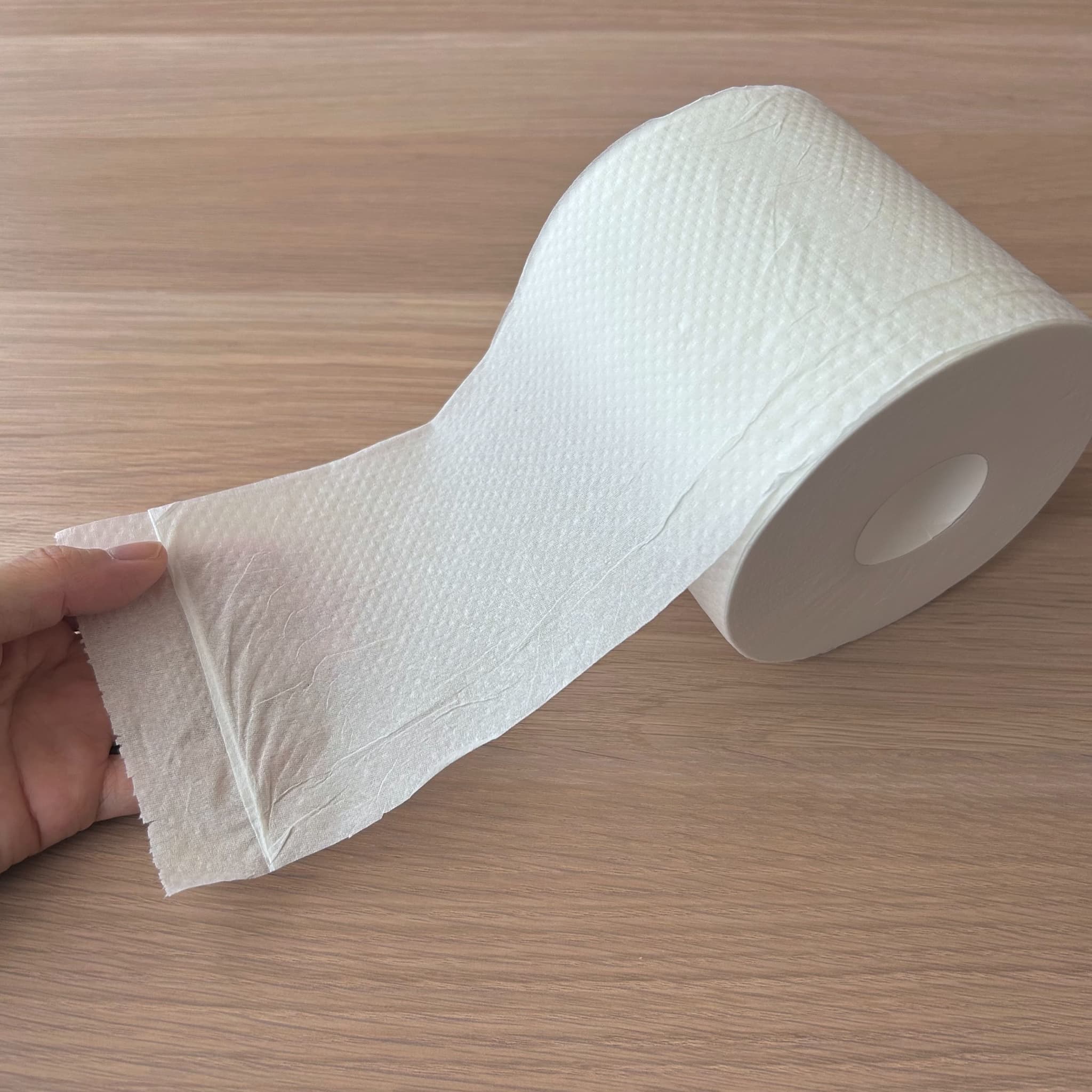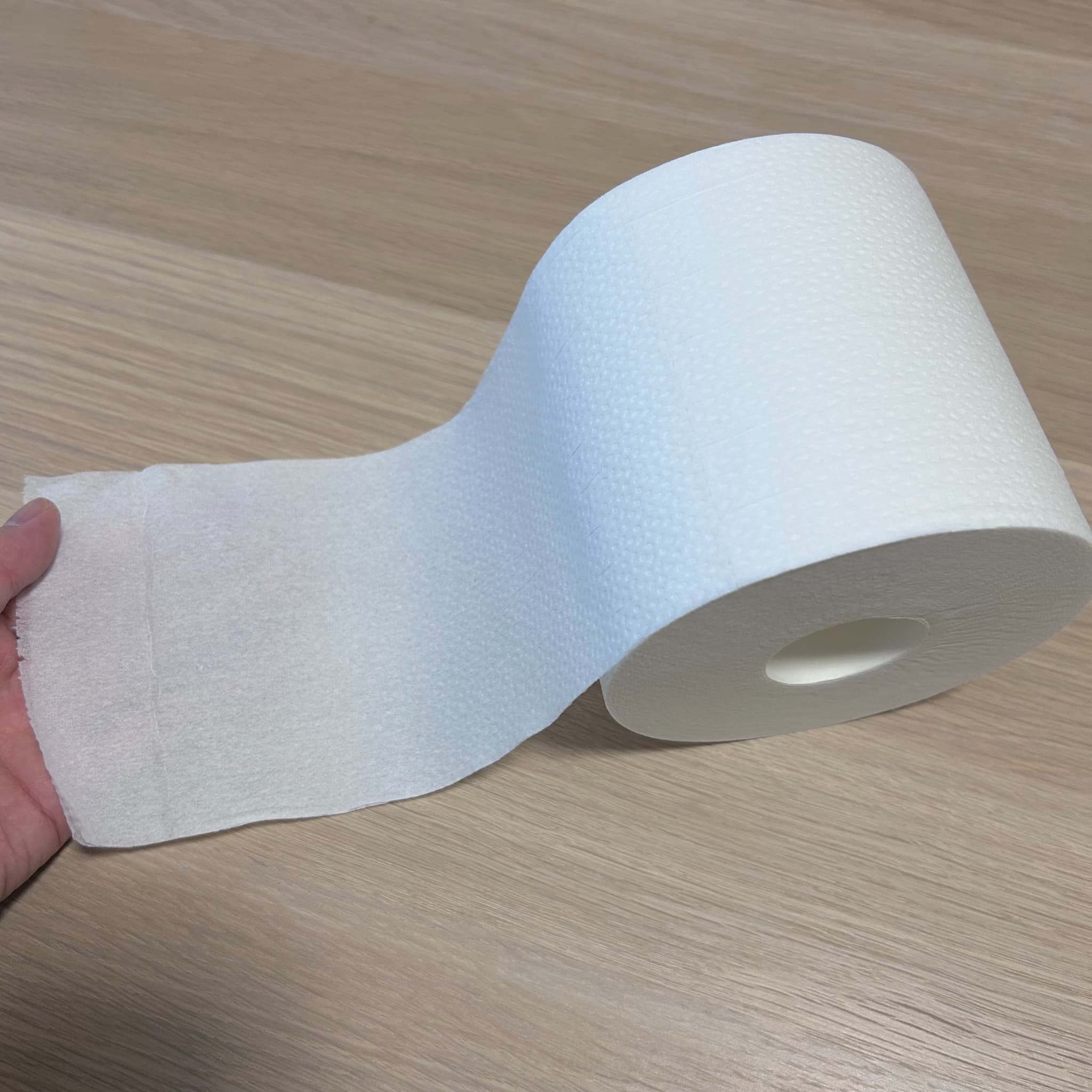 シャワートイレ後もしっかり使える、厚手タイプのトイレットペーパーです。エンボス加工のためやわらかいですが、破れにくく、どちらかと言うとサラサラとなめらかな触り心地です。