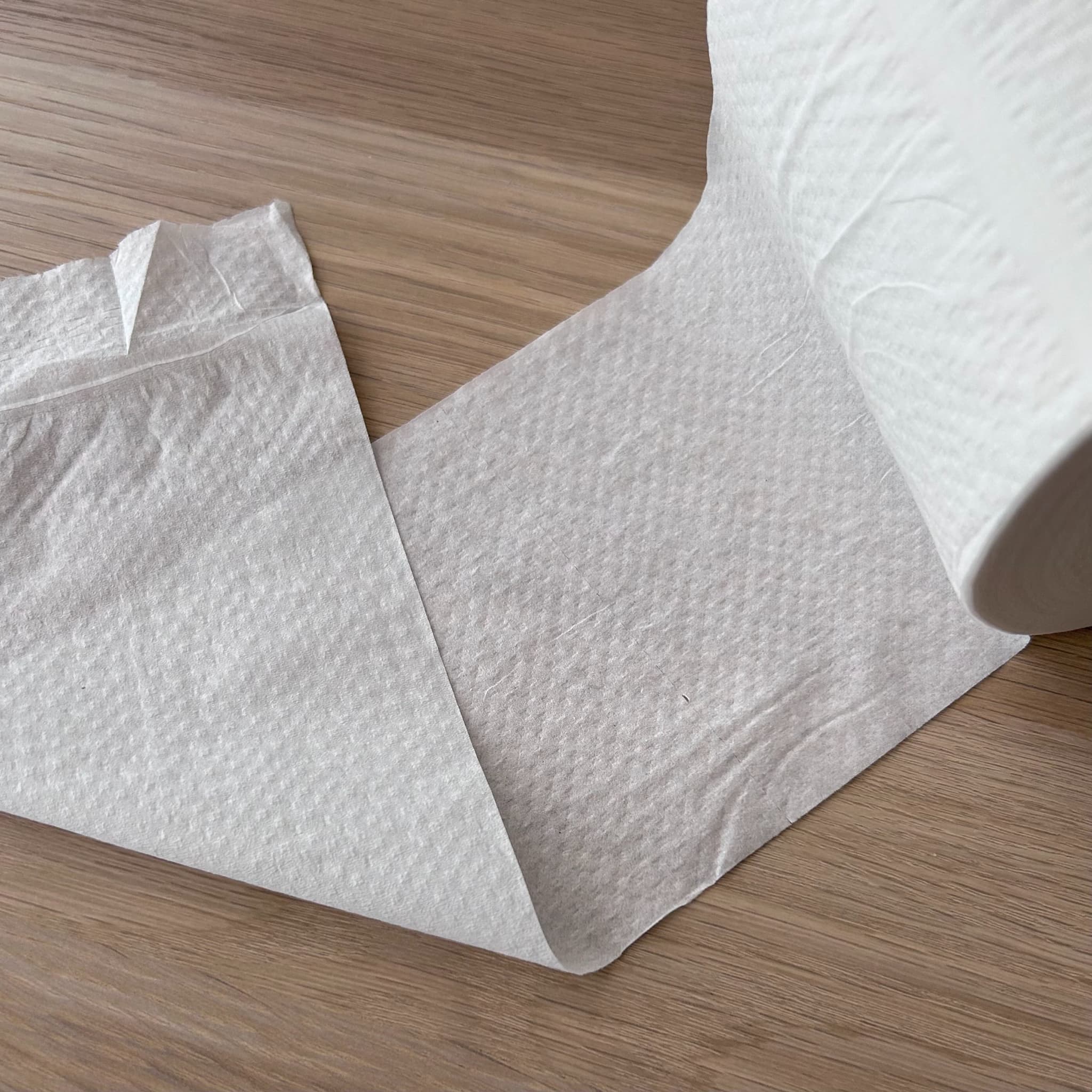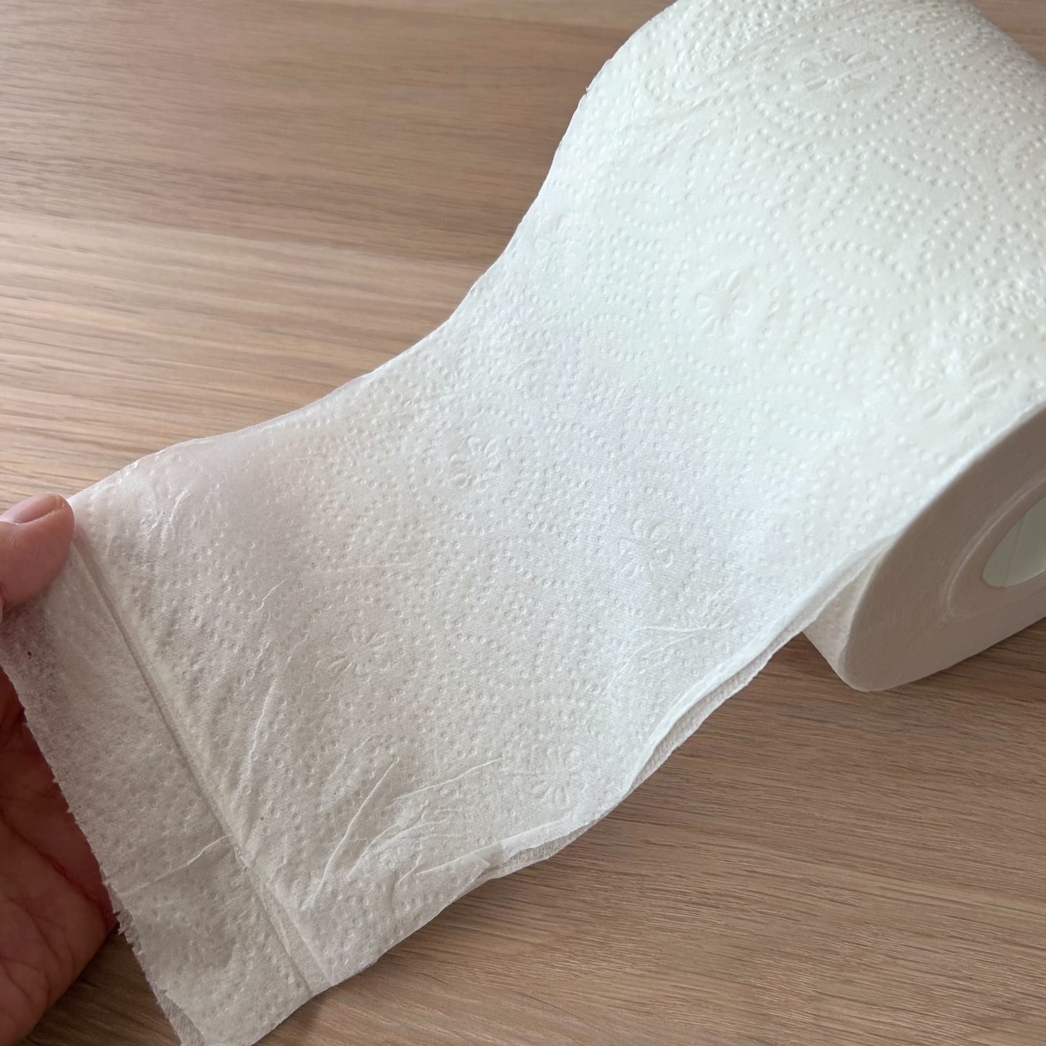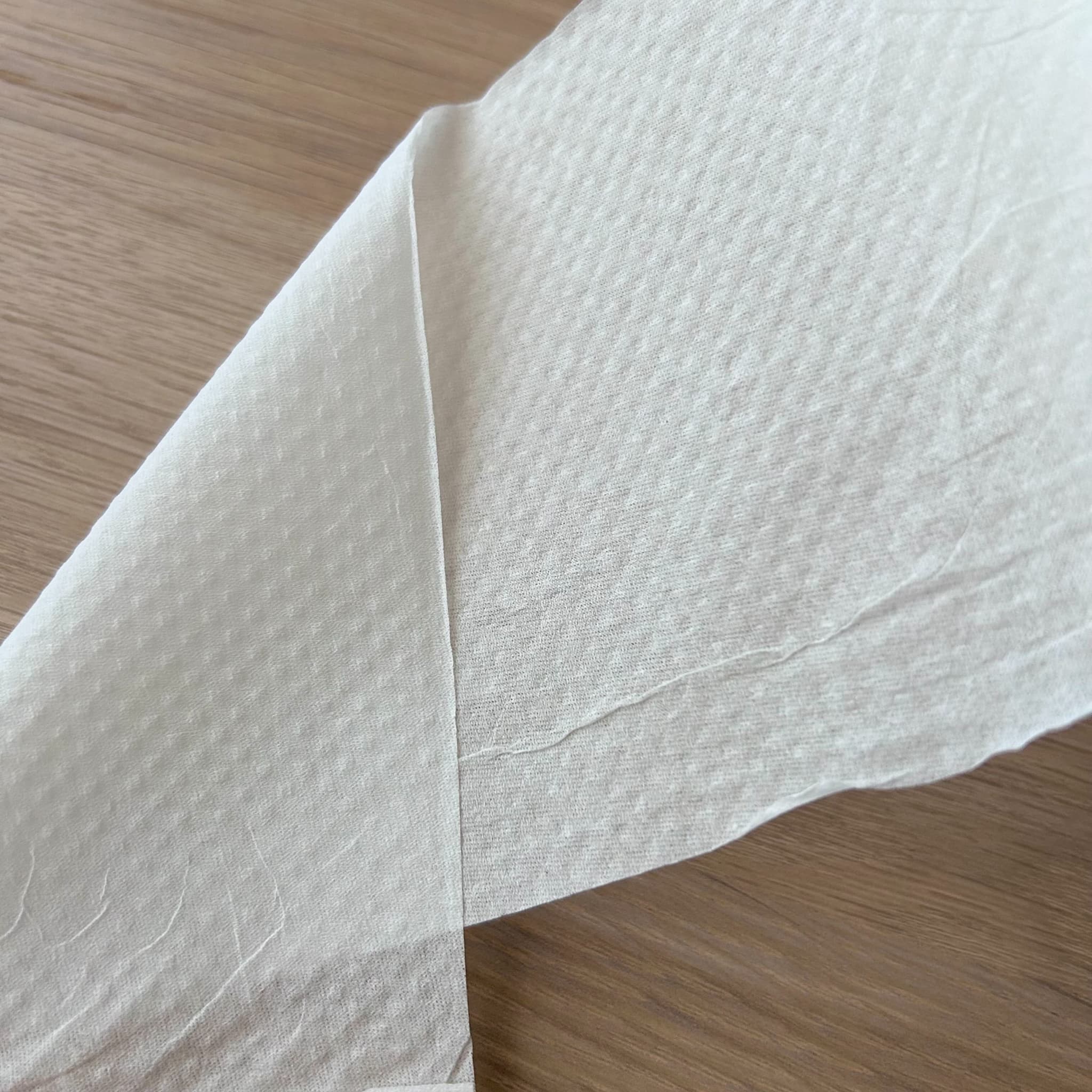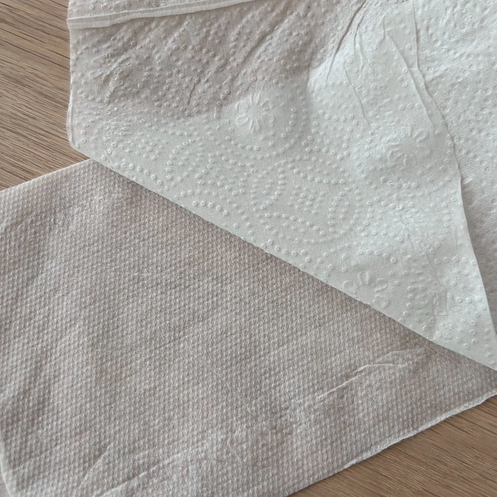 ダブルタイプで丈夫さもあり、安心感のある使い心地です。エンボス加工はありませんが、肌触りはとてもふんわりしています。