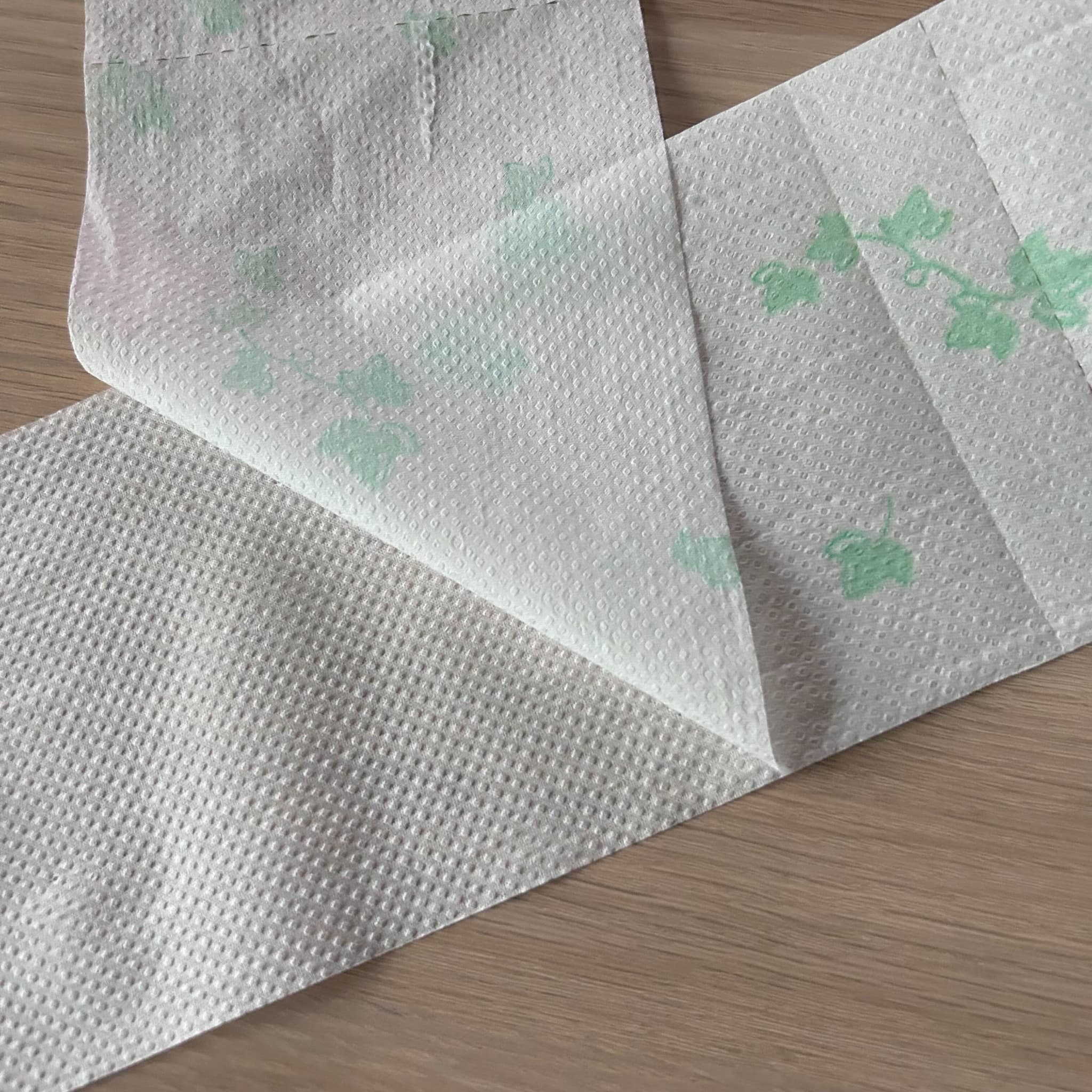 比較的薄めのシングルタイプですが、パルプ100%のためやわらかい使い心地が特徴です。エンボス加工がほどこされていてふんわりとした質感です。