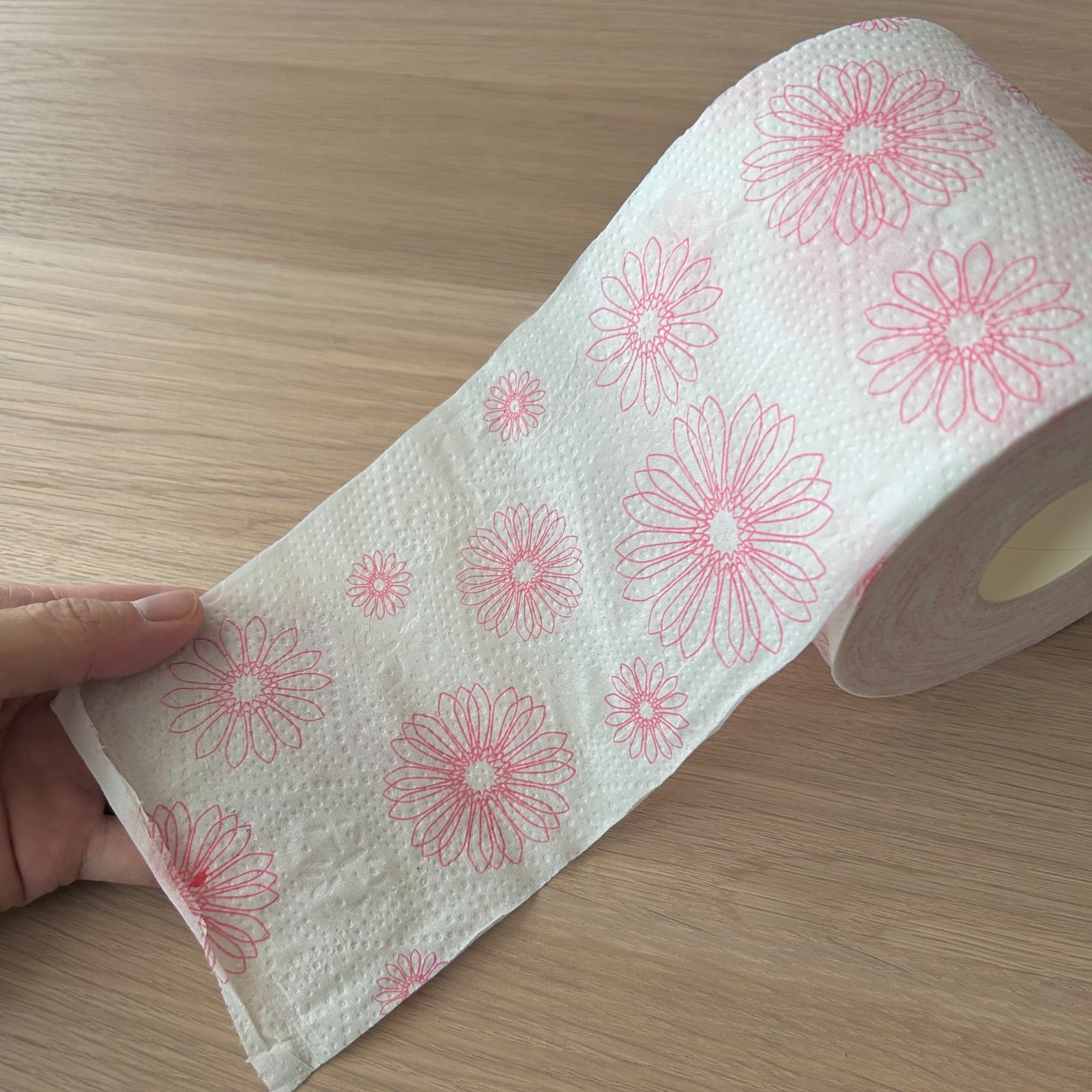 マツモトキヨシ・ココカラファインのオリジナル商品のトイレットペーパー。白地にピンク色の花柄がプリントされています。