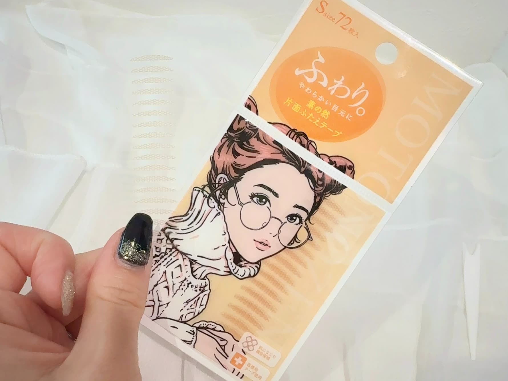 ワンタッチで簡単に貼れるアイテープです。両面タイプで厚いまぶたもきれいな二重を作りやすいですよ。