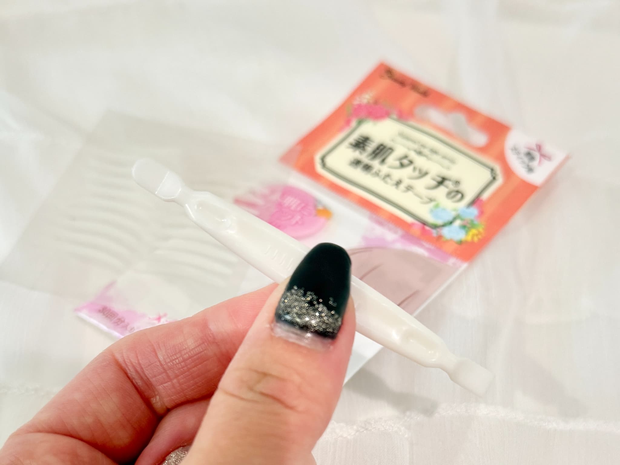 アイテープを台紙から剥がしたりまぶたに貼ったりしやすい、ダブルエンドの専用スティック付きです。先が四角い方でテープを剥がし、先が丸い方でまぶたを軽く押さえてテープをフィットさせます。