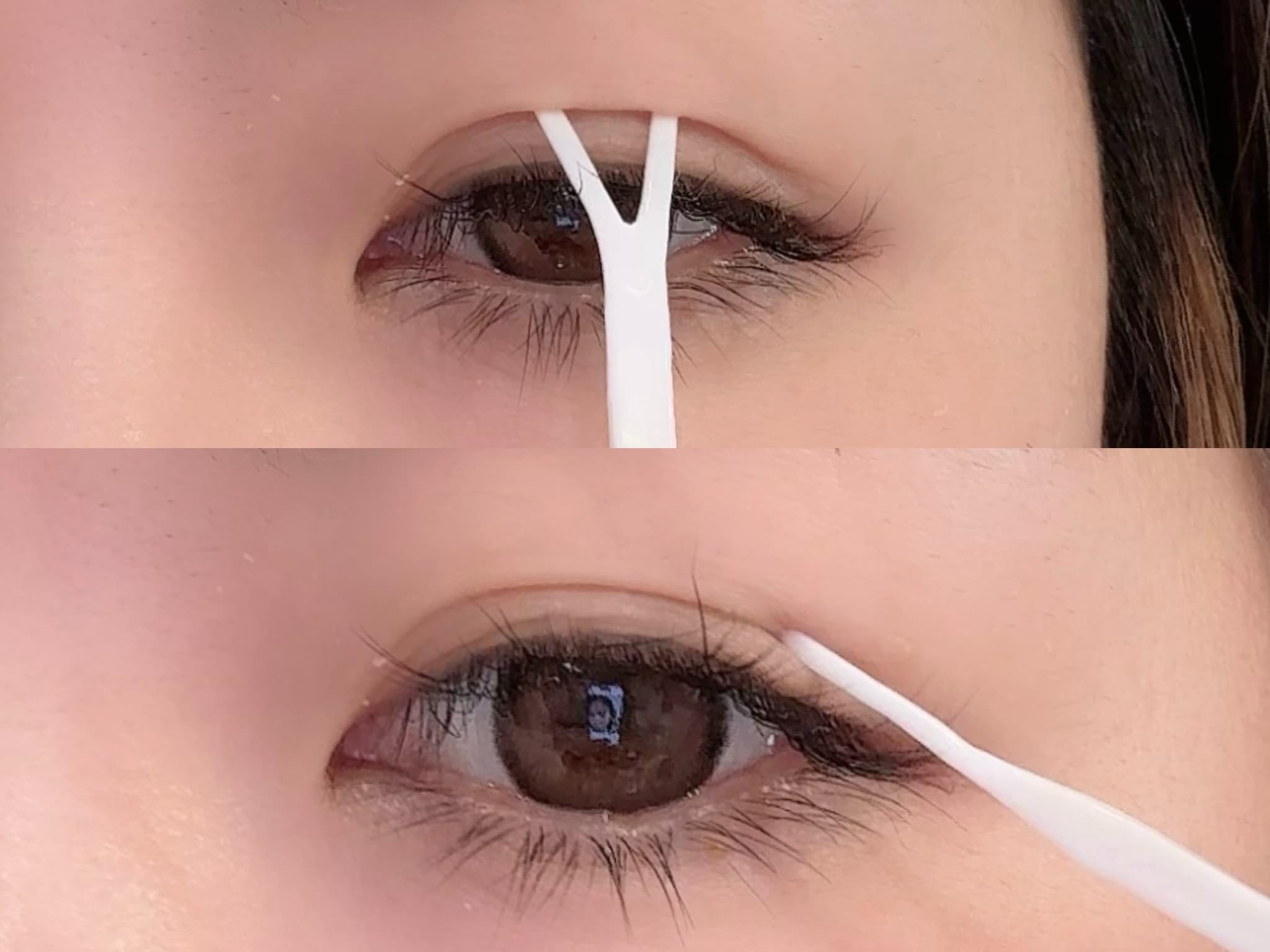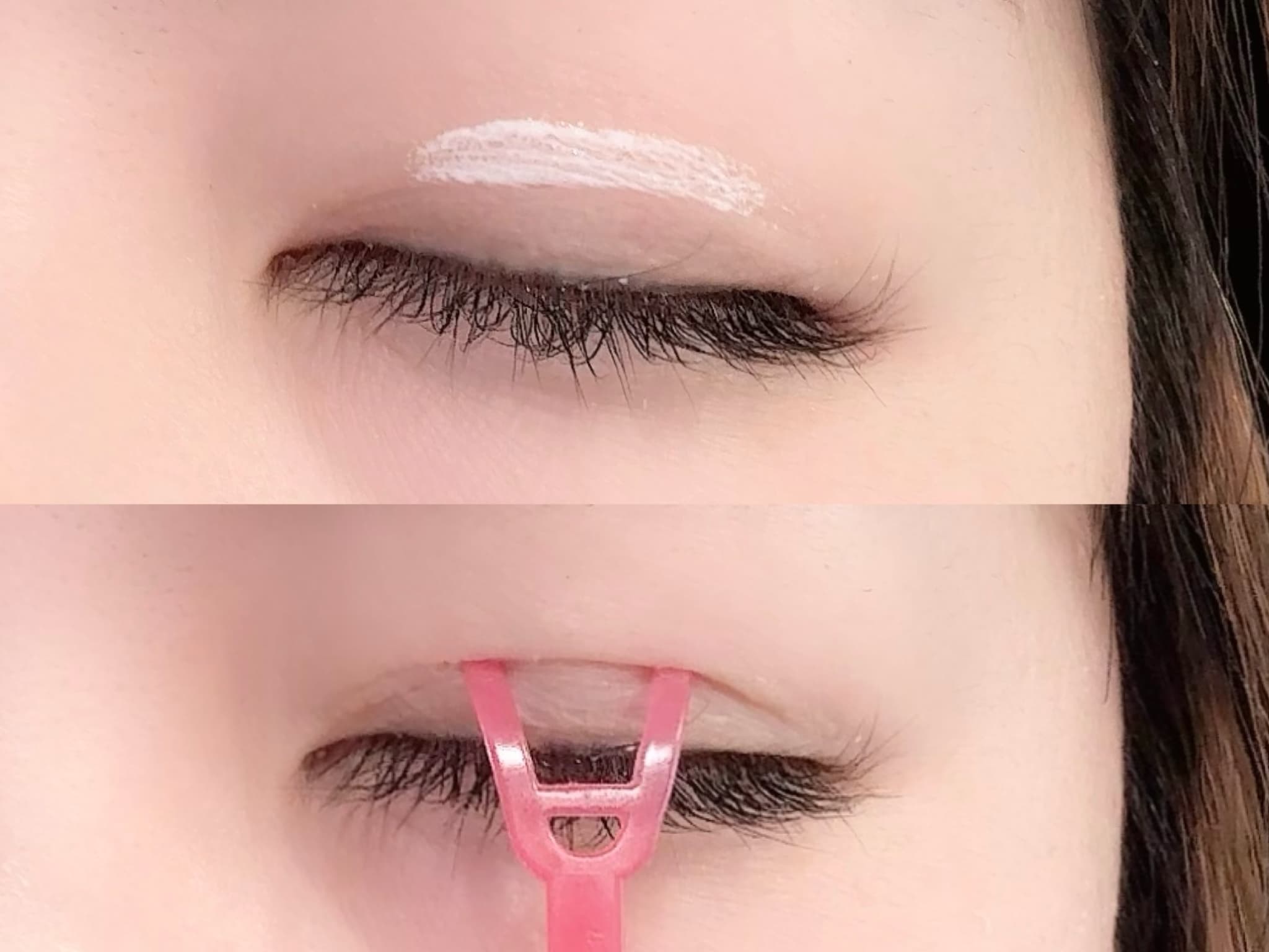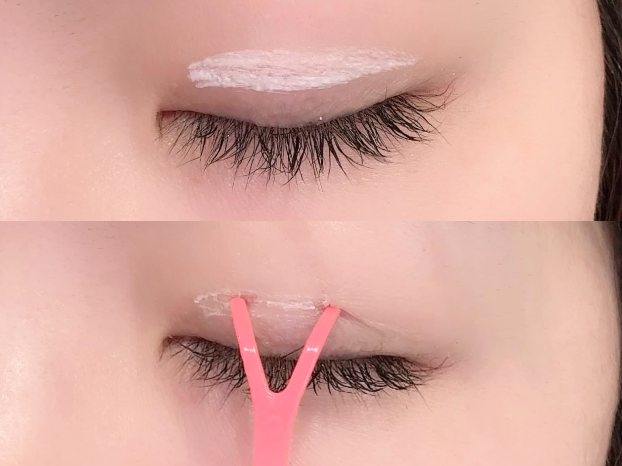 アイテープ、二重のりを使うときに大切なことは、二重のラインを見極めることです。二重のりを塗る前にプッシャーを軽くまぶたに押し当て、線ができる部分が自然に仕上がる二重のラインです。