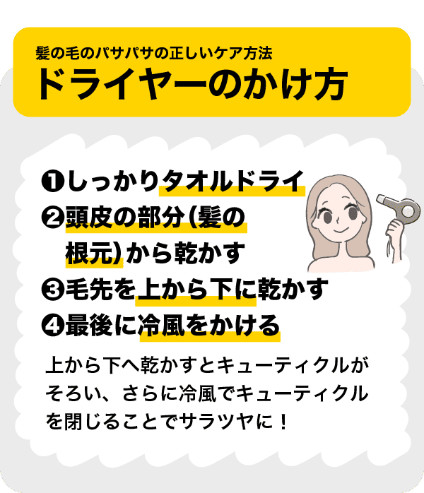 毎日のドライヤーのかけ方を見直すのもパサパサ髪を防ぐおすすめの方法です。しっかりタオルドライをして、頭皮の部分(髪の根元)から乾かしていくと髪を乾かすのが早くなります。