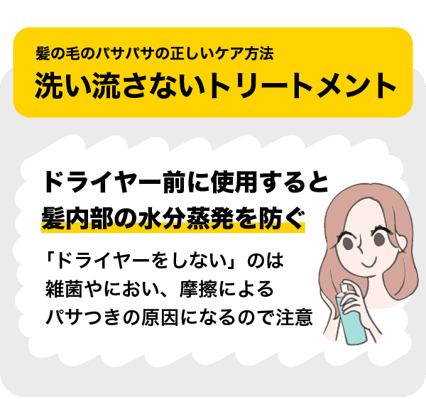 そこでおすすめなのが洗い流さないトリートメントを使用することです。ドライヤーの前に髪につけることで、熱による髪の内部の水分蒸発を防ぎ、パサパサ髪の対策になります。