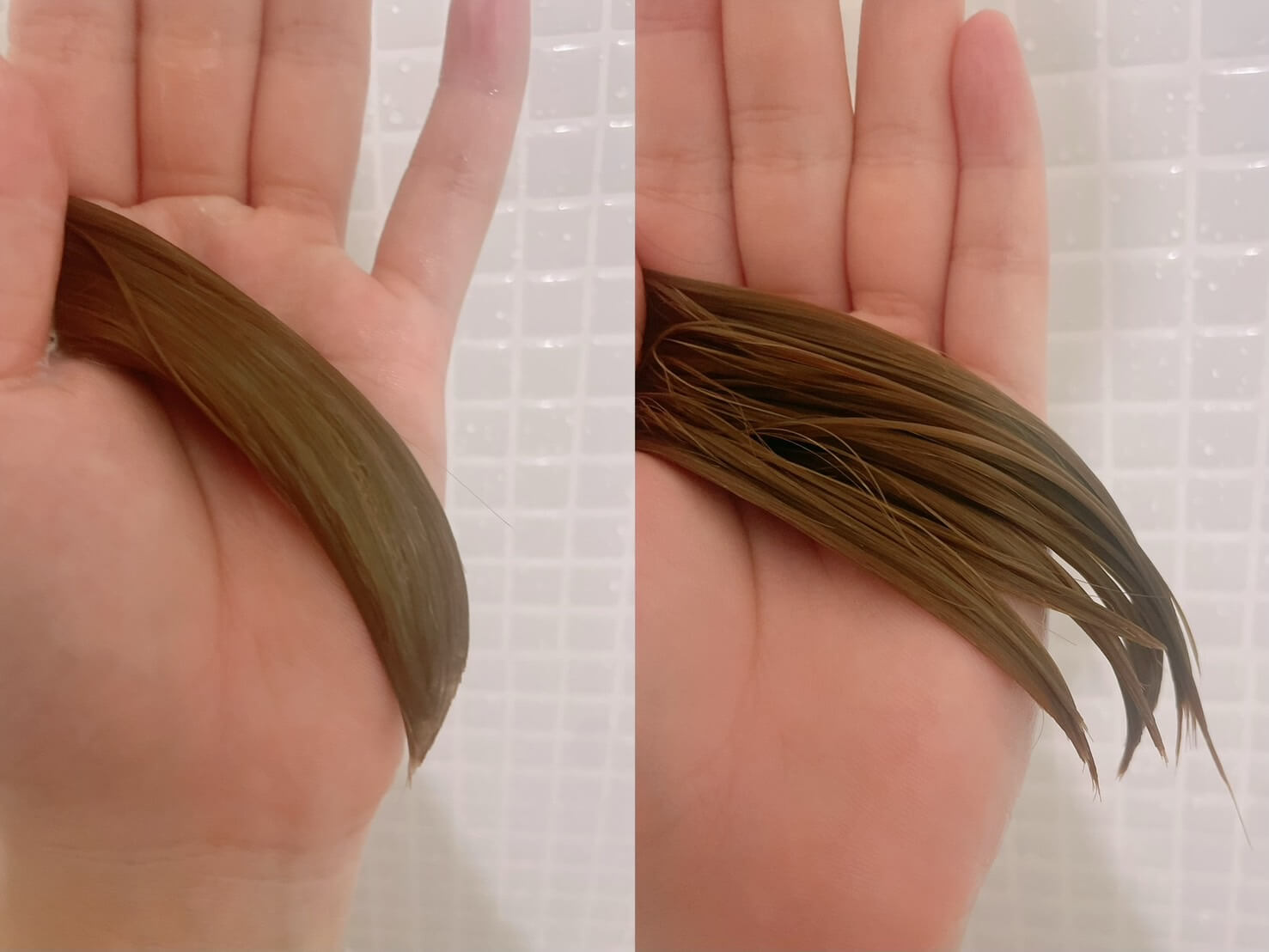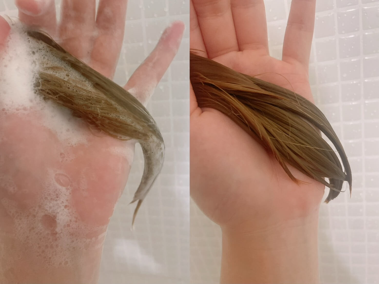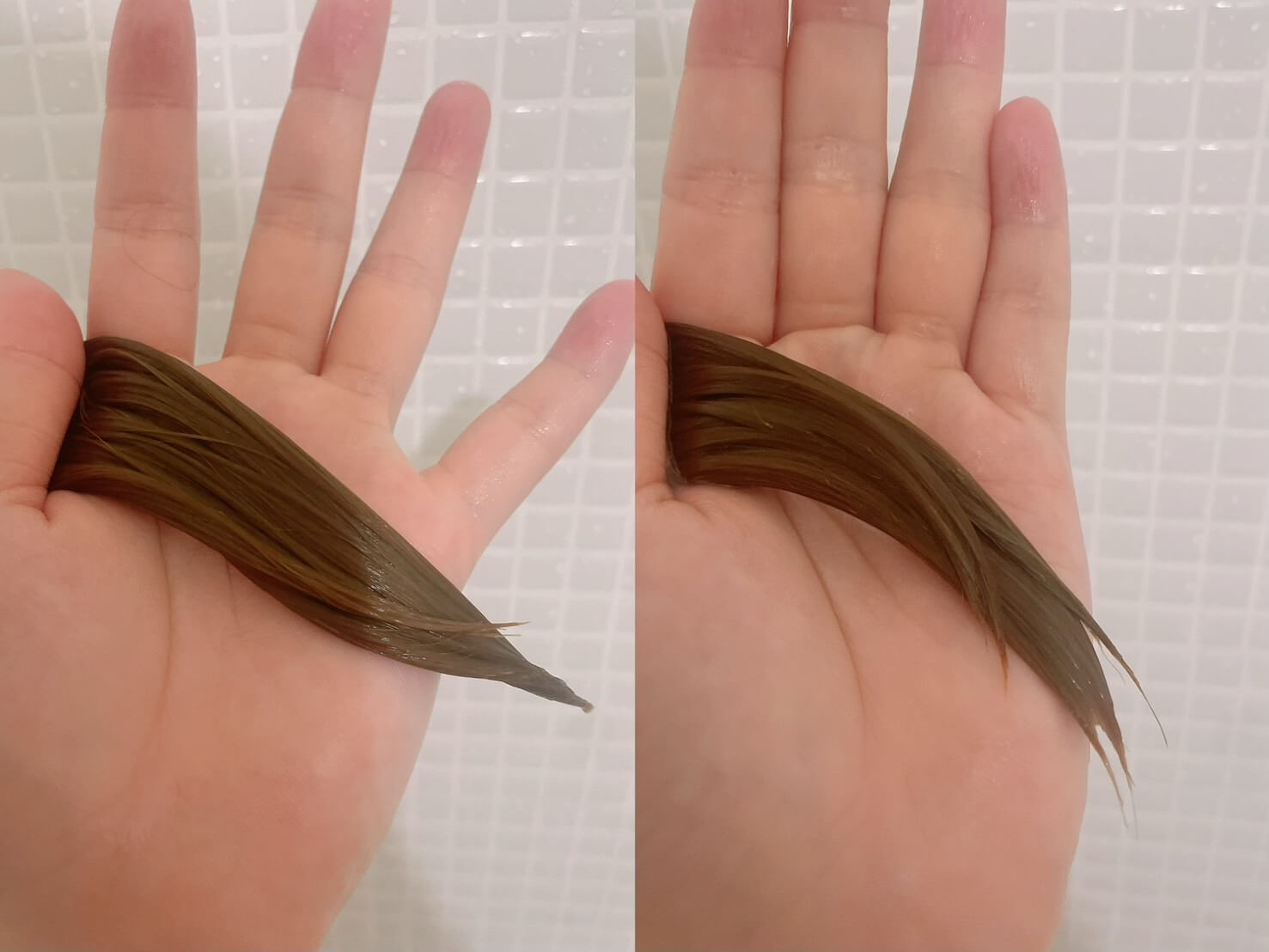 流した後は重すぎずつるんとなめらかな手ざわりになった気がします。頬ずりしたくなるようななめらかでやわらかな髪に仕上がります。