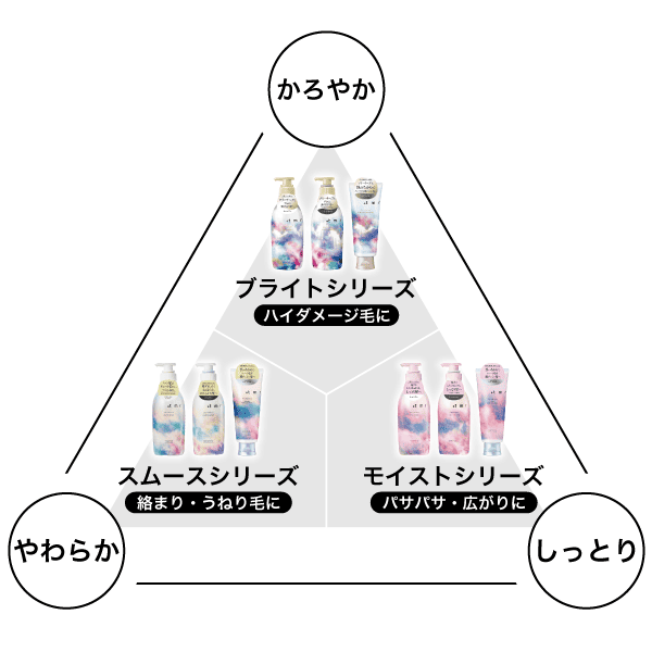 「ブライトシリーズ」は、ブリーチやカラーを繰り返したハイダメージ毛に起こってしまうパサつきを抑えようとケアを重ねると重たい仕上がりになってしまう、という悩みの救世主。するんと風になびくかろやかな髪に仕上げます。ヘアカラーやブリーチを楽しみながらもやわらかくかろやかな髪へ仕上げます。