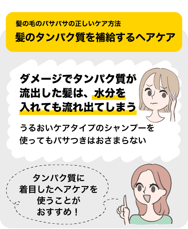 ダメージによって流出した髪のタンパク質を補給できるヘアケアを使用する