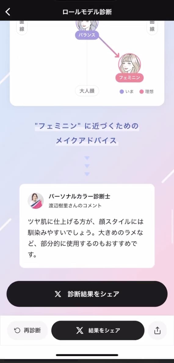 なりたい顔に近づくためのアドバイスとして、プロのパーソナルカラー診断士によるコメントを見ることができます。具体的なアドバイスは参考になりますね。
