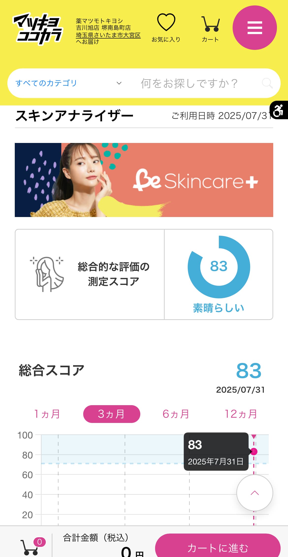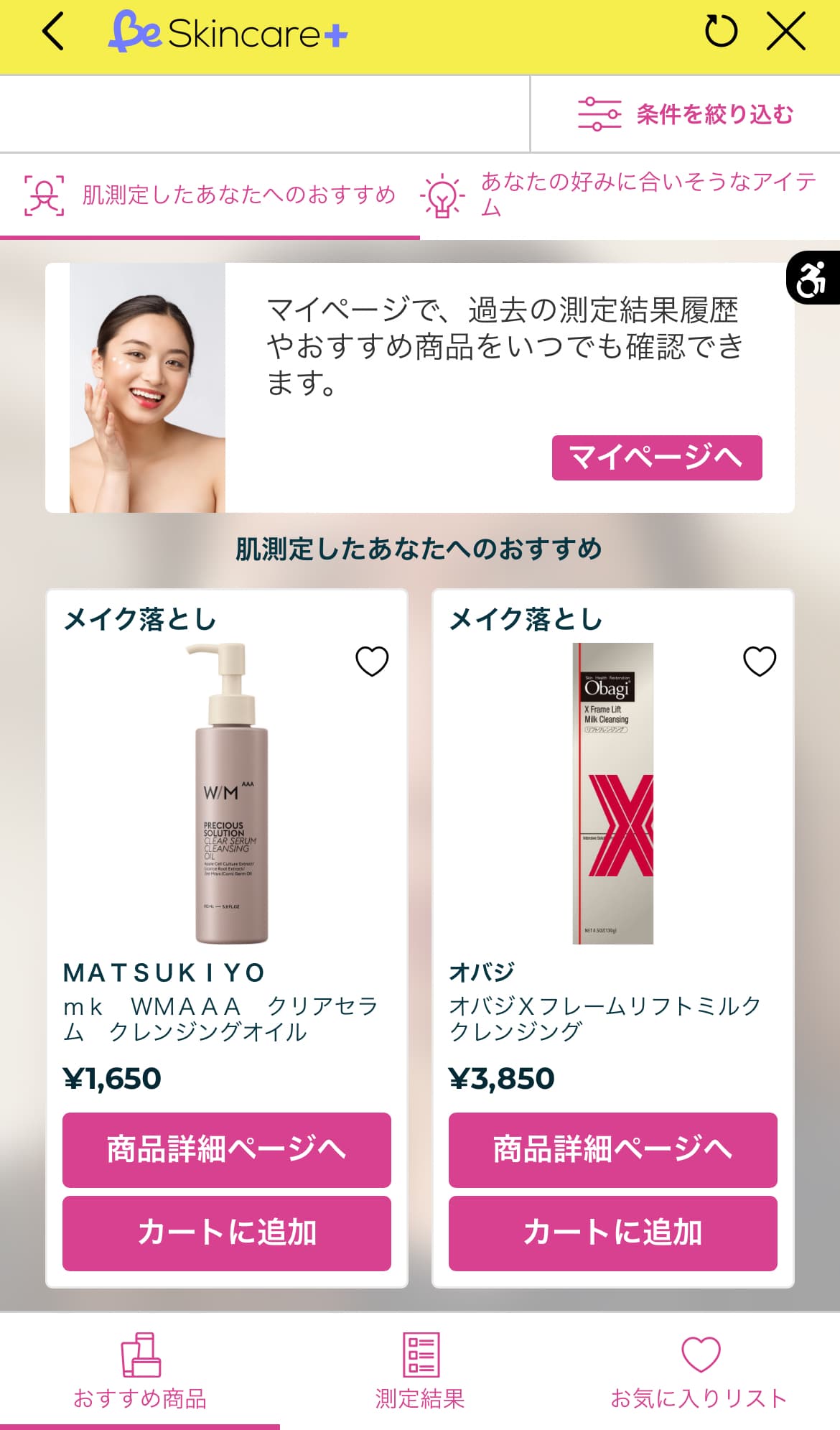 また、測定結果は記録され、マツキヨココカラBeのマイページからいつでも見返すことが可能。定期的に測定すれば、肌状態のレポートを確認でき、肌管理やお手入れに役立てられますよ。