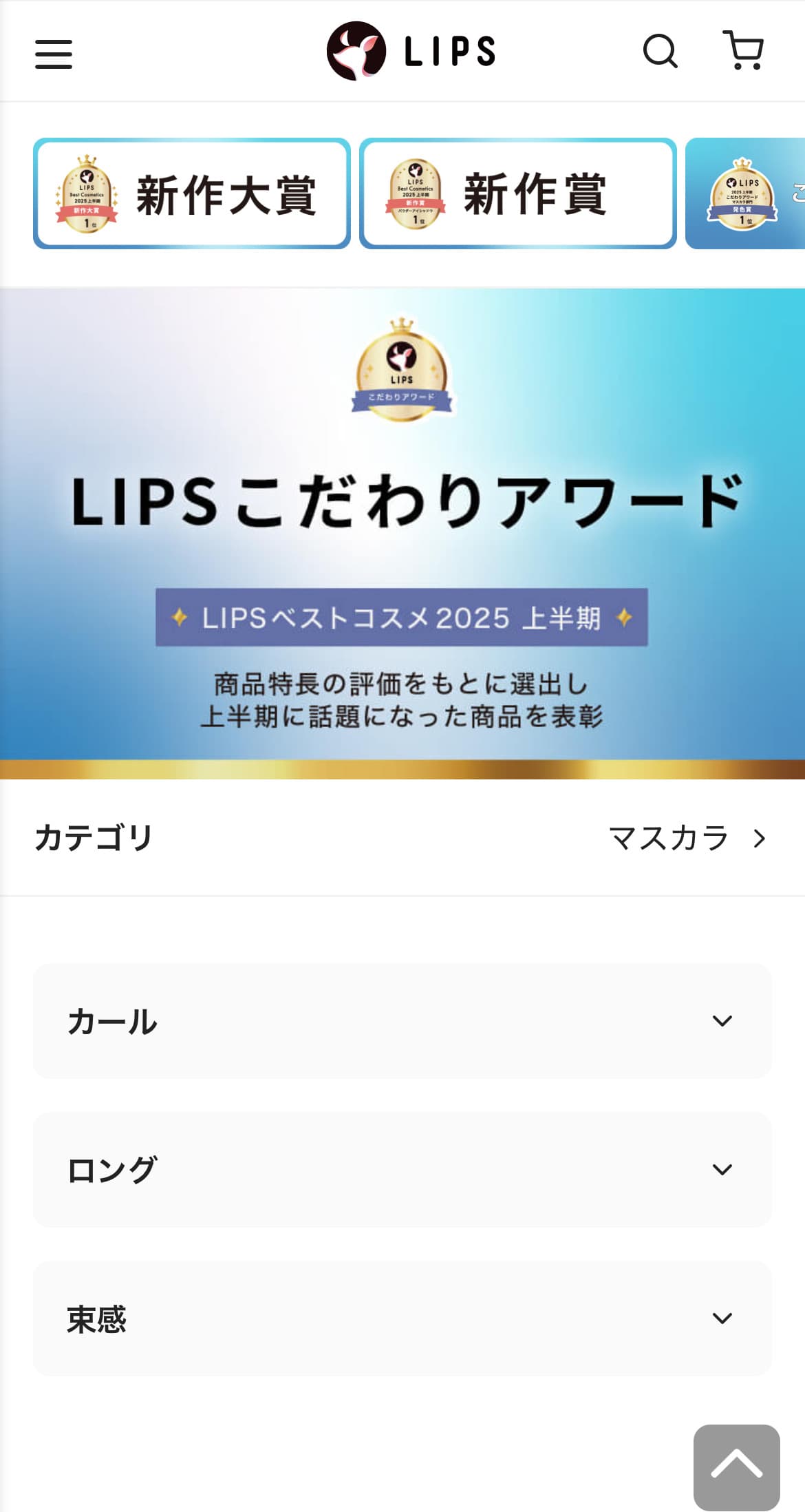 「LIPS こだわりアワード」では商品特徴の評価をもとに選出された商品が表彰されており、自分の好きな特徴の人気商品を知ることができます。