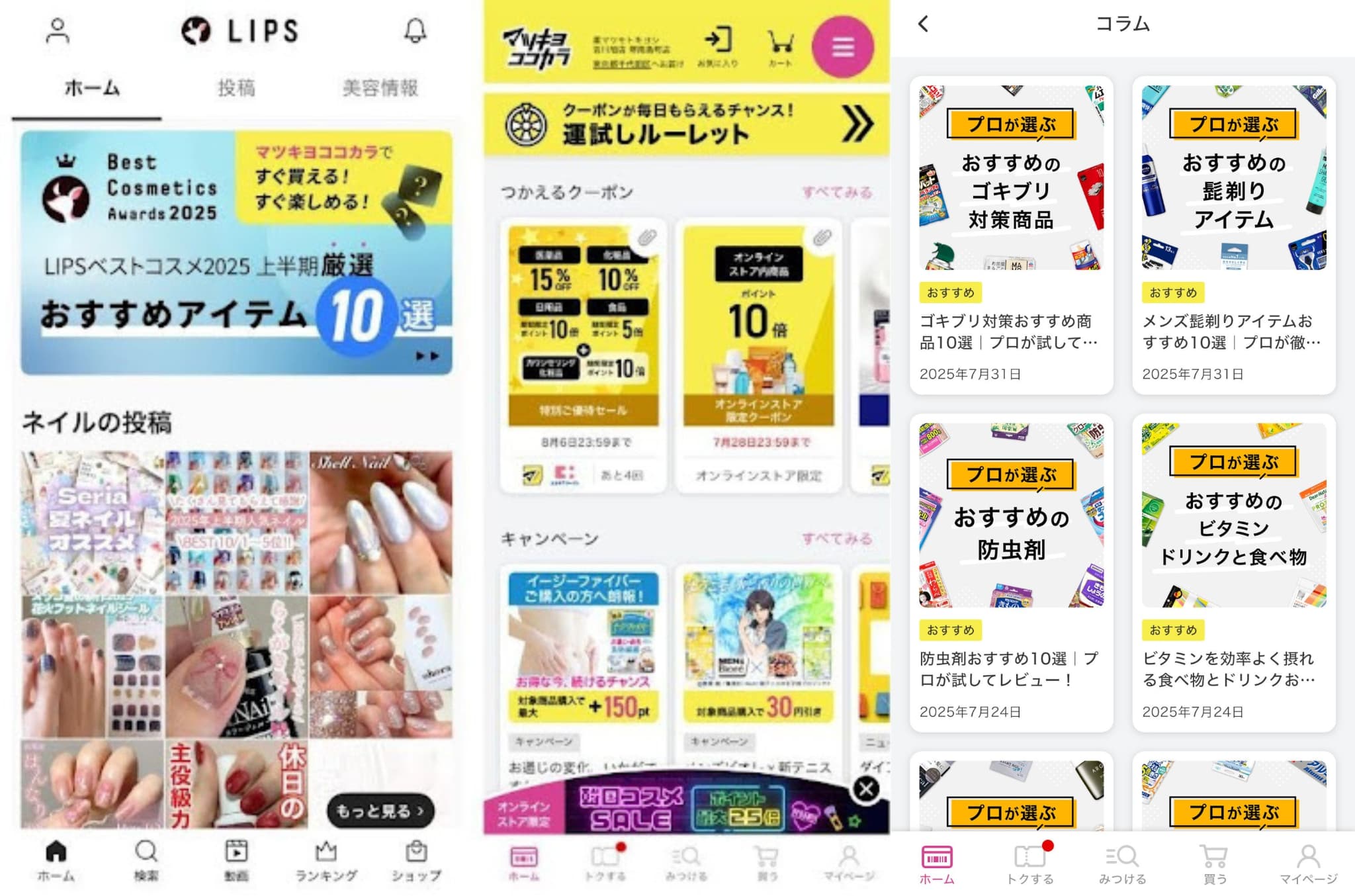 プロ視点のおすすめアイテムはマツキヨココカラのコラムでチェックし、ピンポイントで気になる商品のレビューはLIPSで検索する、など使い分けがおすすめですよ。