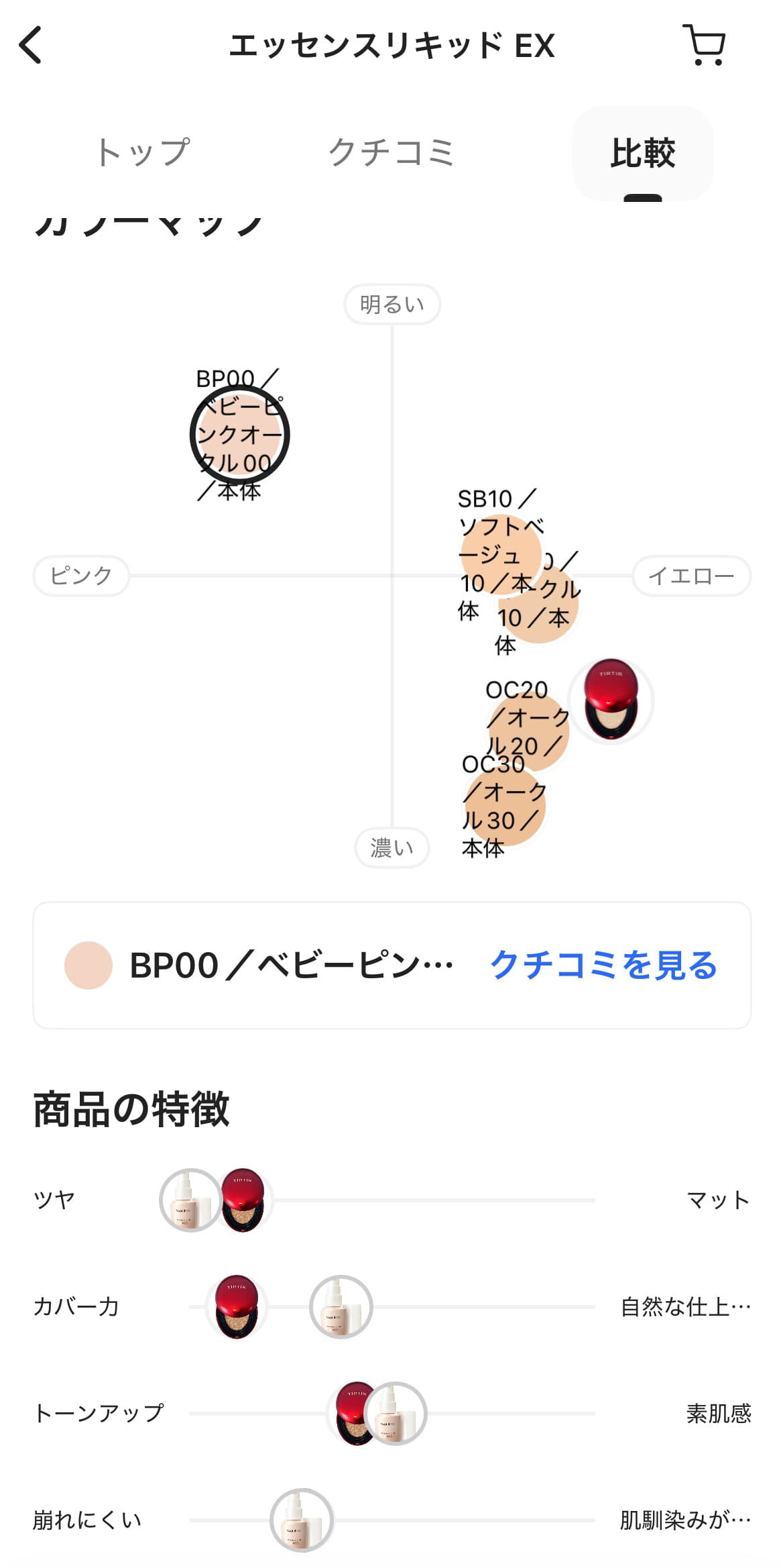 また、ツヤ/マット、カバー力、くずれにくさなど、商品の特徴も視覚的に表示されるため、アイテム同士を比較しやすいです。オンラインショッピングではテスターを試すことができないため、購入を迷っている際の参考材料になって助かります。