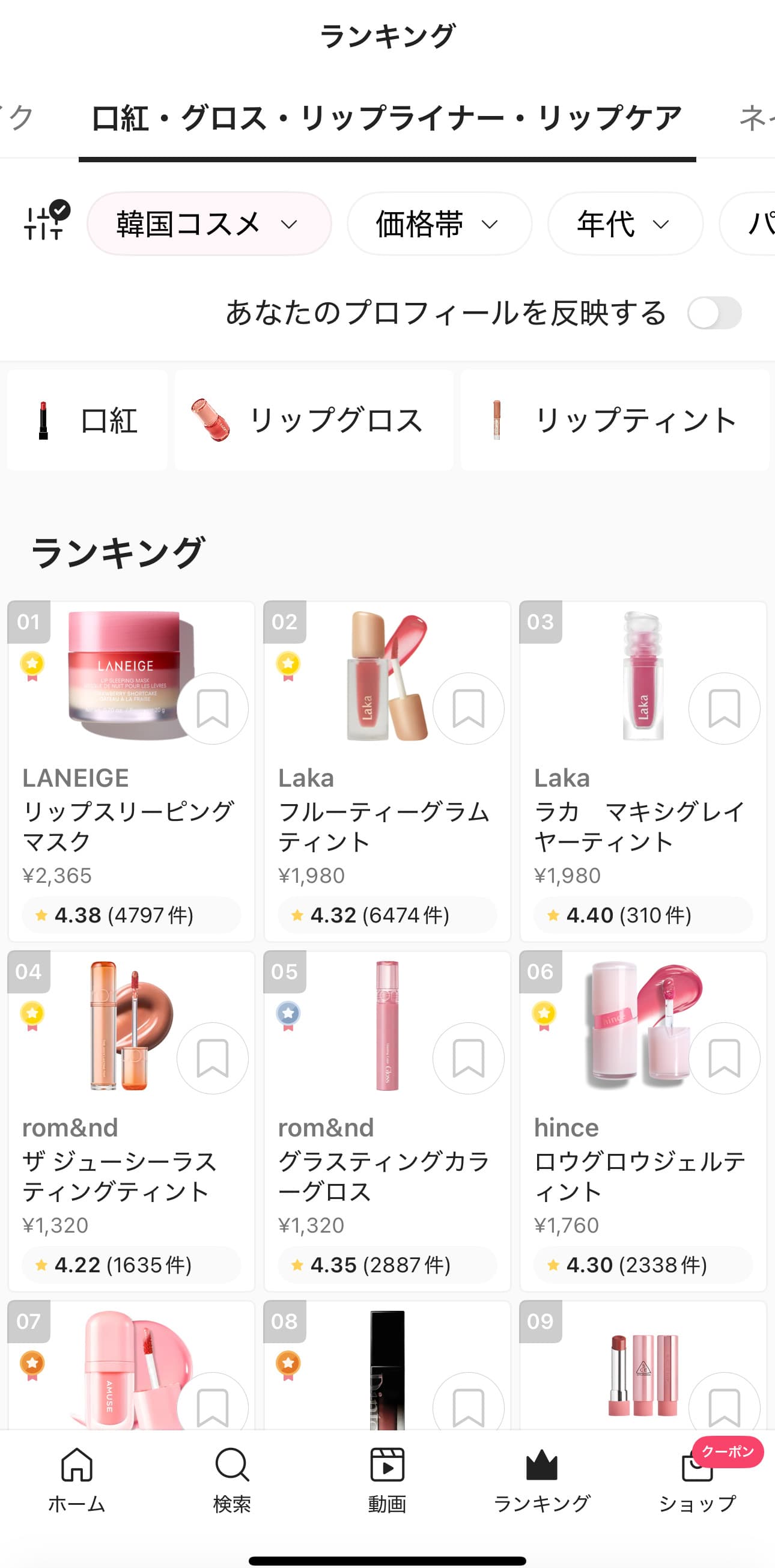 例えば、この画像は「韓国コスメの口紅」部門の人気ランキングです。アイテムをタップすればクチコミを閲覧でき、そのまま購入に進むこともできます。