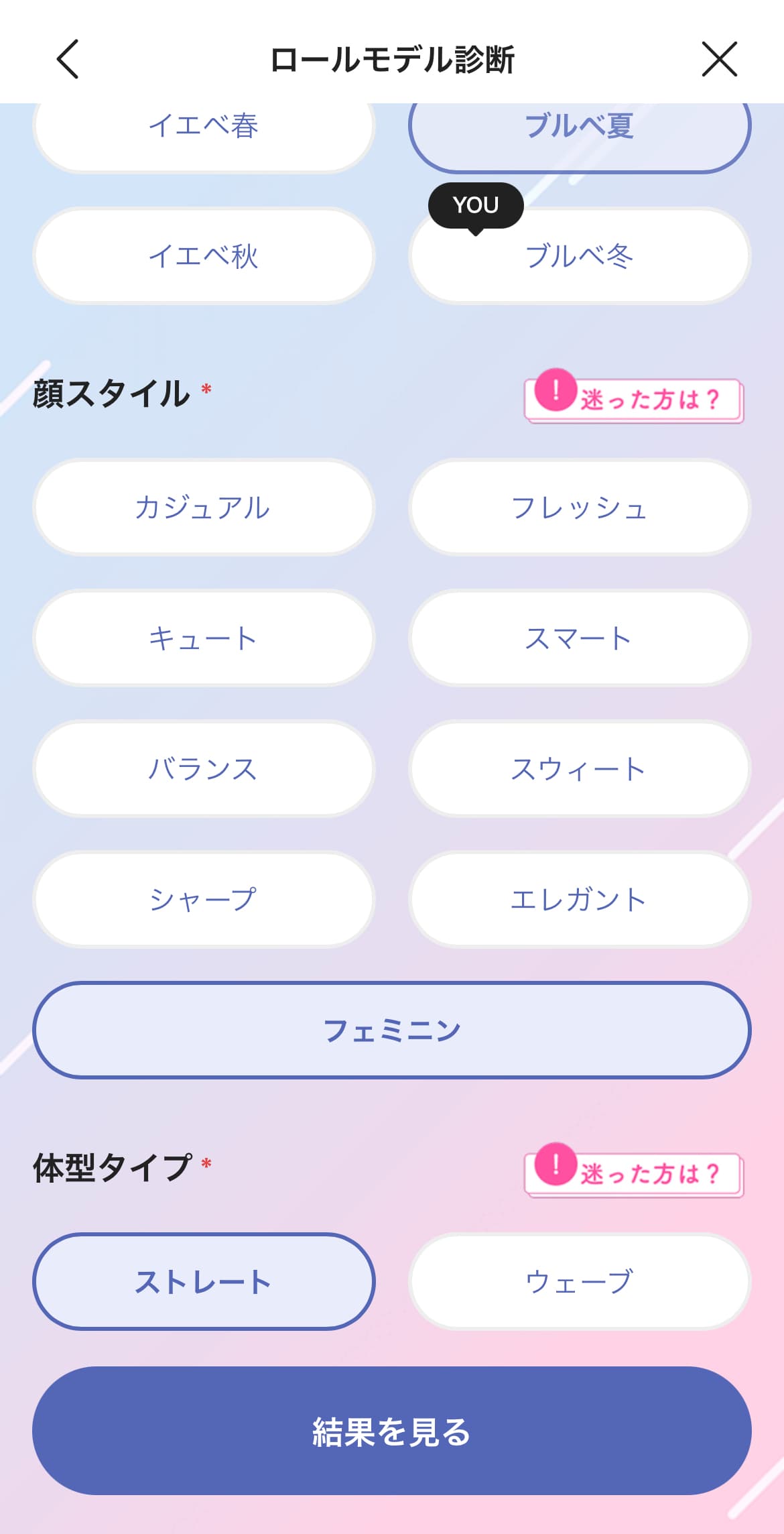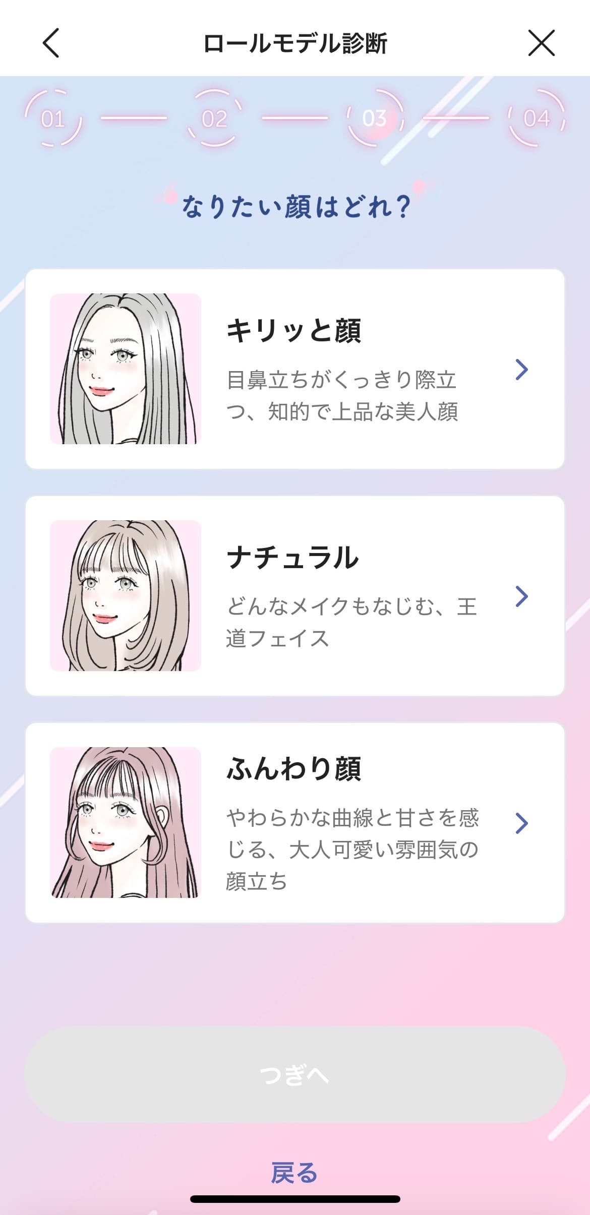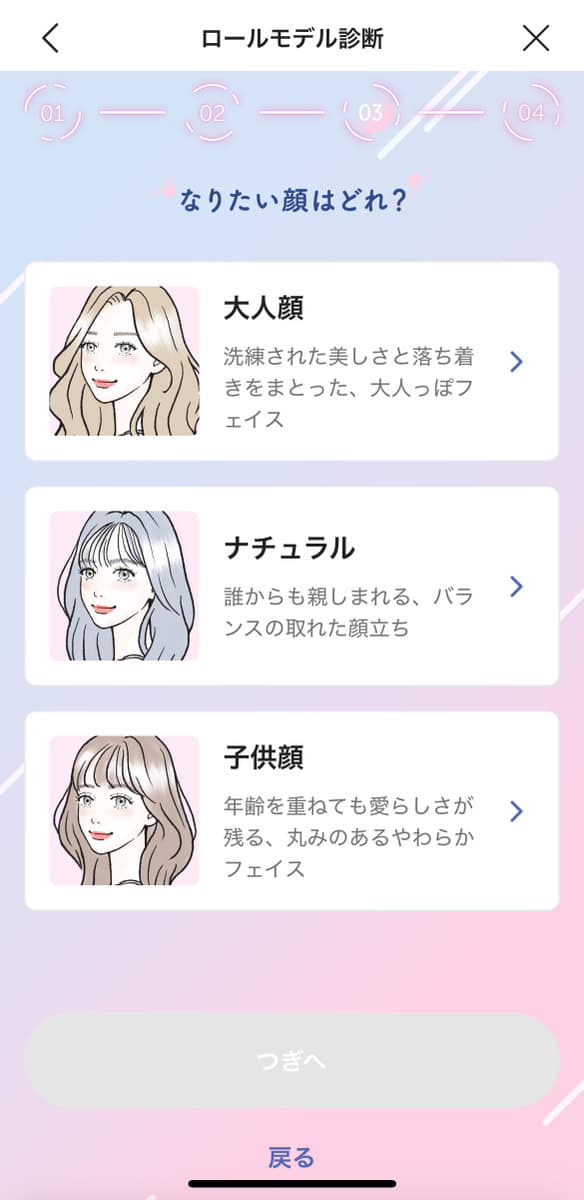 次になりたい顔(大人顔orナチュラルor子供顔/キリッと顔orナチュラルorふんわり顔)を選択し、生まれた年やパーソナルカラー(イエベ/ブルベ)などいくつかの質問に答えます。