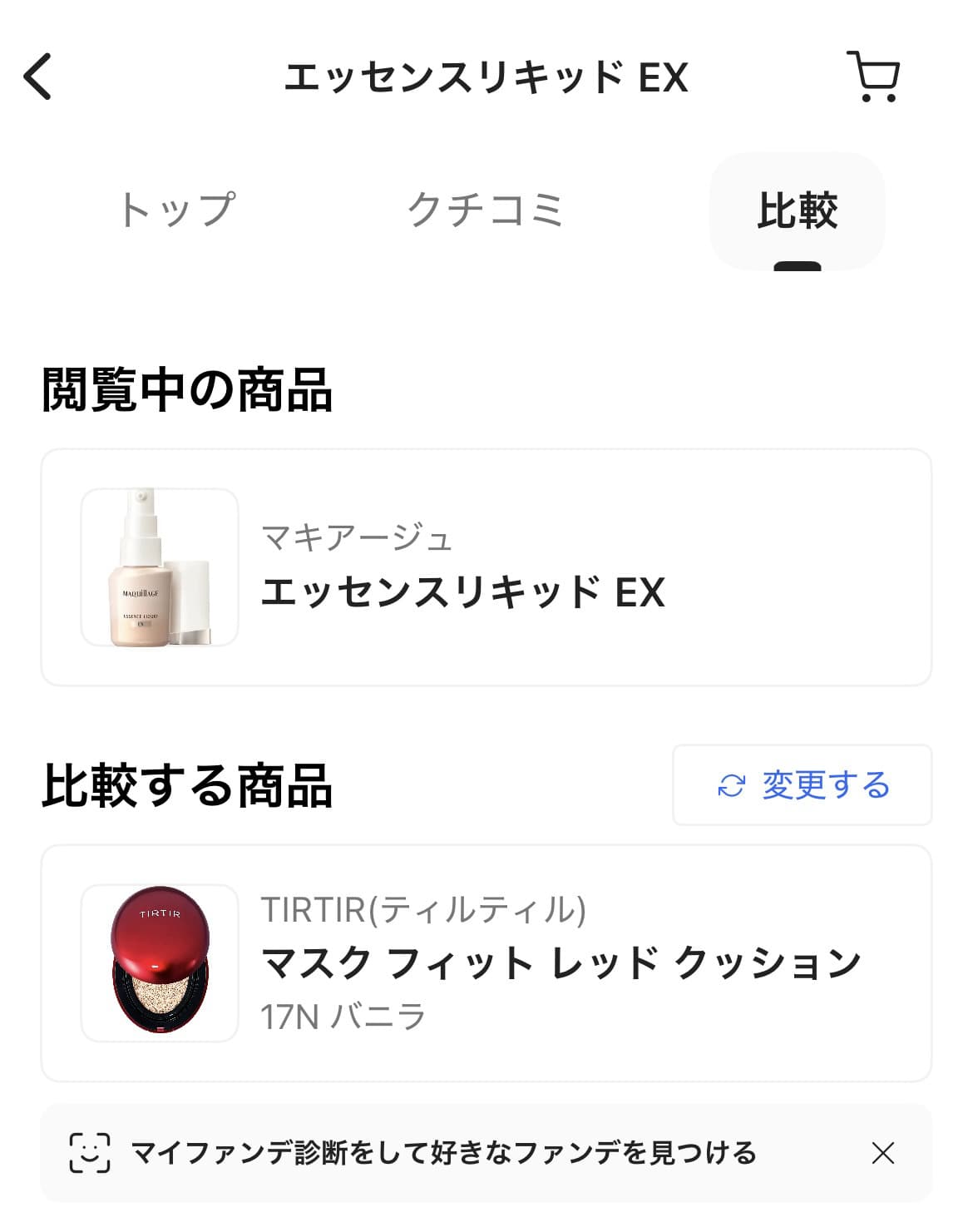 例えば、購入を検討中の「マキアージュ エッセンスリキッドEX」と、手持ちの愛用コスメ「TIRTIR マスク フィット レッド クッション」を比較してみます。