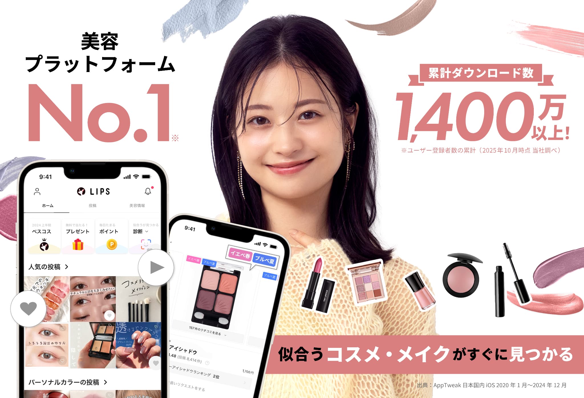 LIPSは2017年1月にサービスを開始した美容プラットフォーム。コスメ好きのユーザーによるリアルなクチコミが好評を博しており、2025年10月には1,400万ダウンロード※を達成し、日本最大級のコスメ・美容サービスへと成長しました。