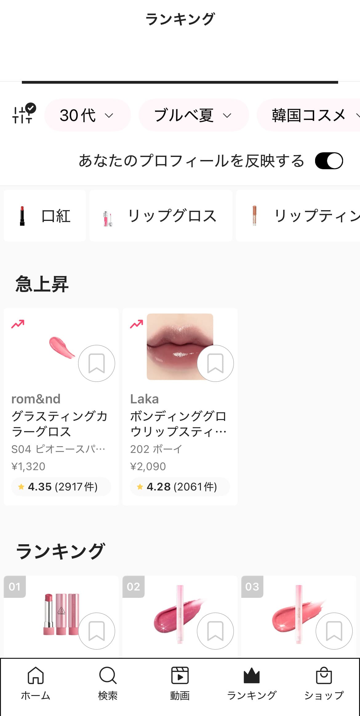 さらに、「あなたのプロフィールを反映する」ボタンをオンにすると、自分に合ったアイテムが絞り込めます。筆者の場合「30代」「ブルベ夏」のユーザーから人気があるアイテムが表示されました。