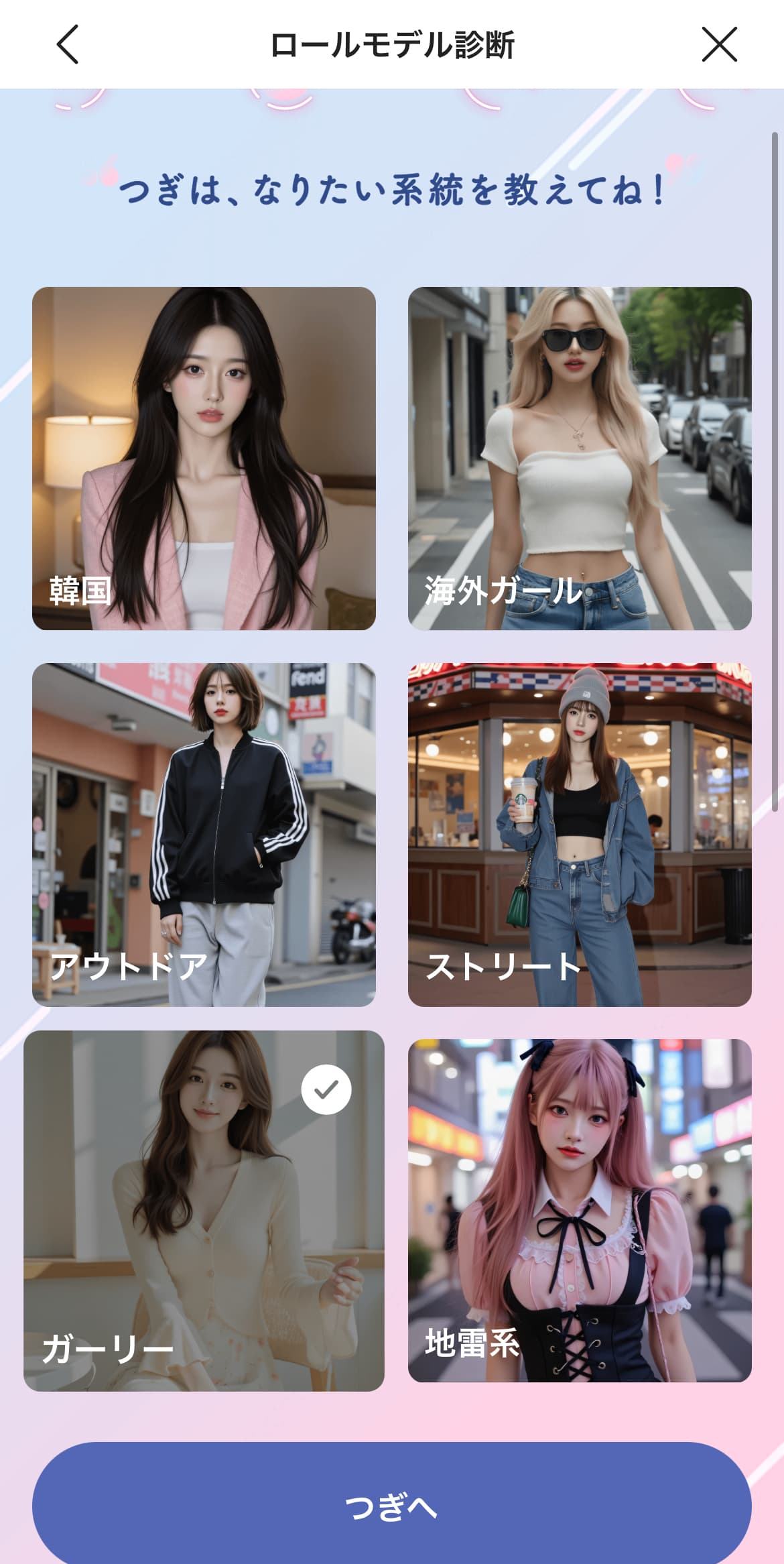 初めに顔写真を撮影し、次に、なりたい系統を選択して進みます。トレンドの韓国系や海外ガール、ストリートやガーリー、地雷系、アウトドアなど数タイプから、なりたい雰囲気をチョイスしましょう。