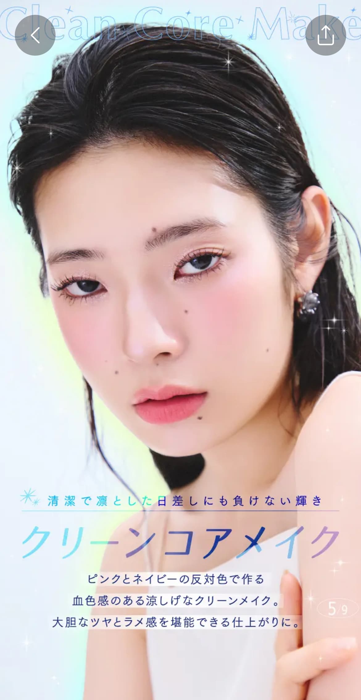 こちらは「クリーンコアメイク」のルックです。ピンクとネイビーの反対色で作る、血色感と涼しげな印象がミックスされた、洗練されたメイクが素敵です。