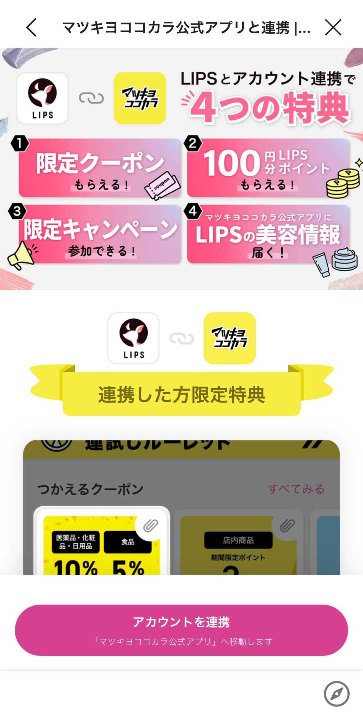 LIPSとマツキヨココカラは別アプリですが、アカウント連携をすると特典が得られます。連携したアカウント限定で100円分のLIPSポイントがもらえたり、クーポンが届いたりと、買い物がより楽しめます。