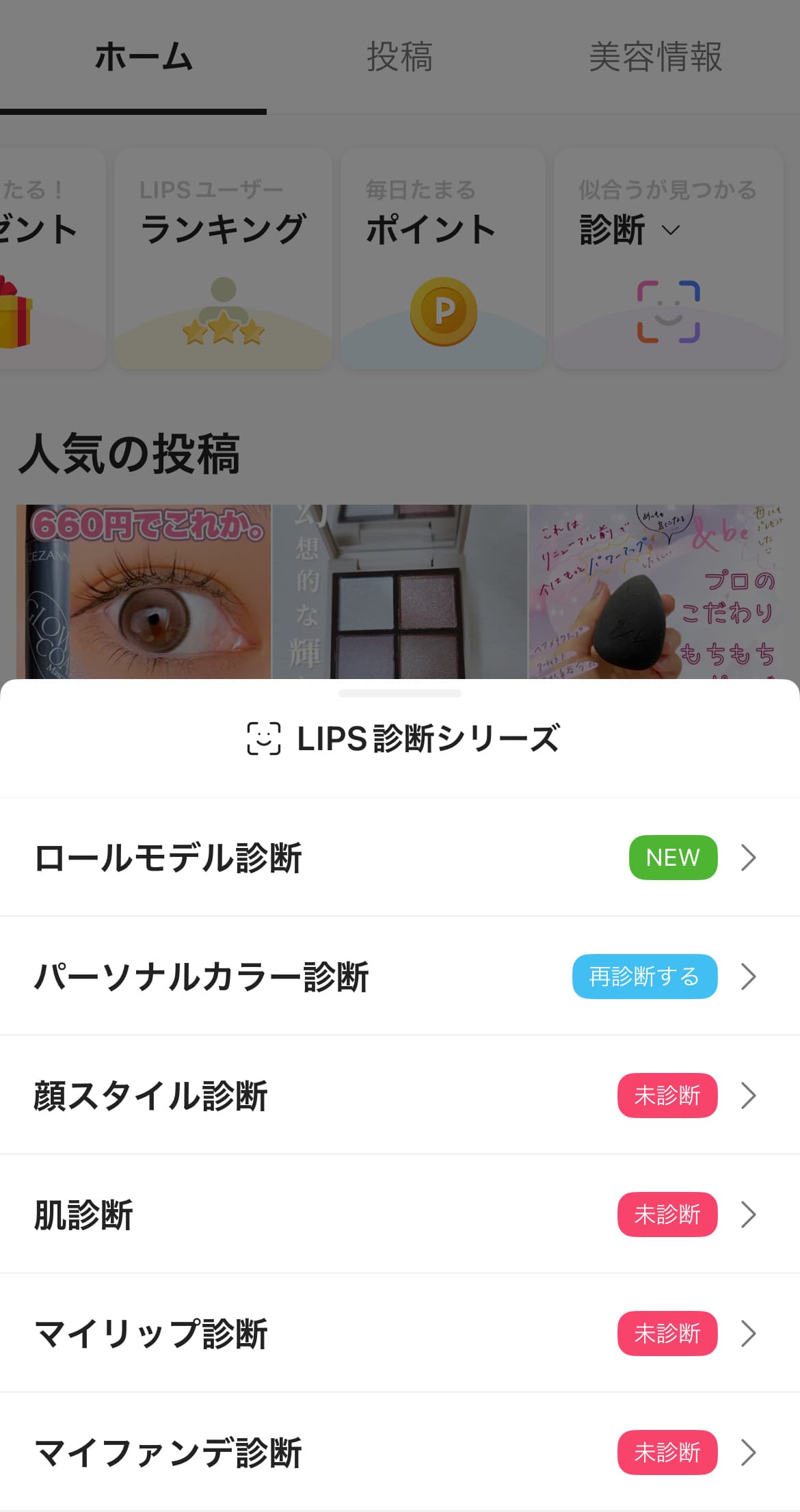 LIPSではさまざまなAI診断機能が充実しており、パーソナルカラー(イエベ/ブルベ)診断をはじめ顔スタイル診断、肌診断などが行えます。