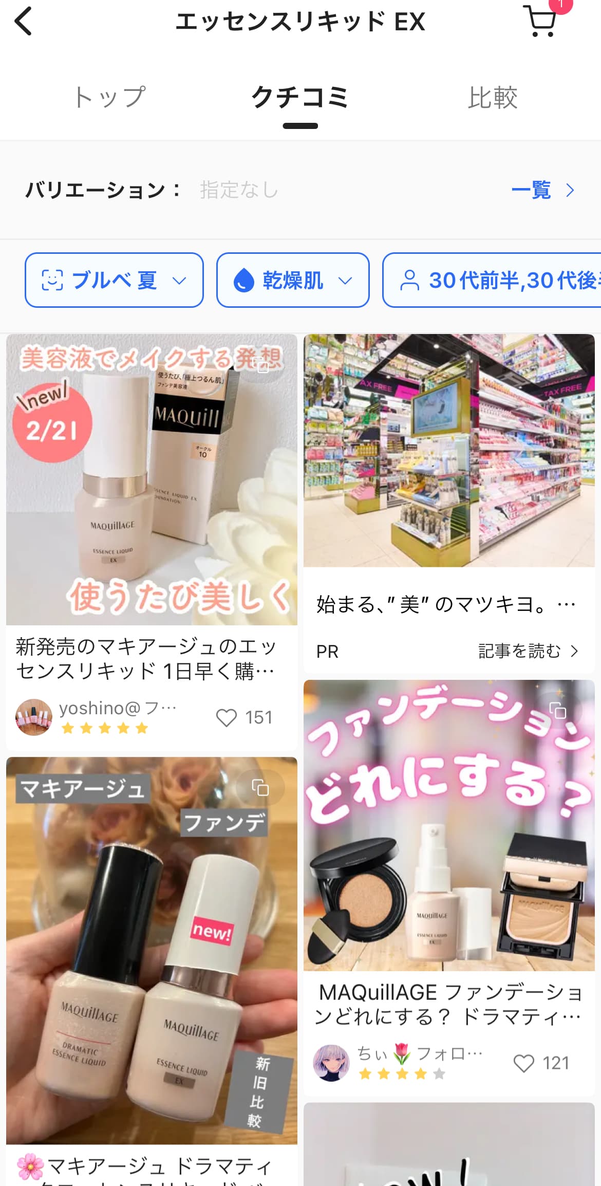 また、クチコミを好みの条件で絞り込める点がとても便利です。例えば「ブルベ夏」「乾燥肌」「30代前半・後半」「購入者のクチコミ」を選択すると、画像のように該当するクチコミのみが表示されます。自分の肌タイプや年齢に近いユーザーの意見を参考にできますよ。