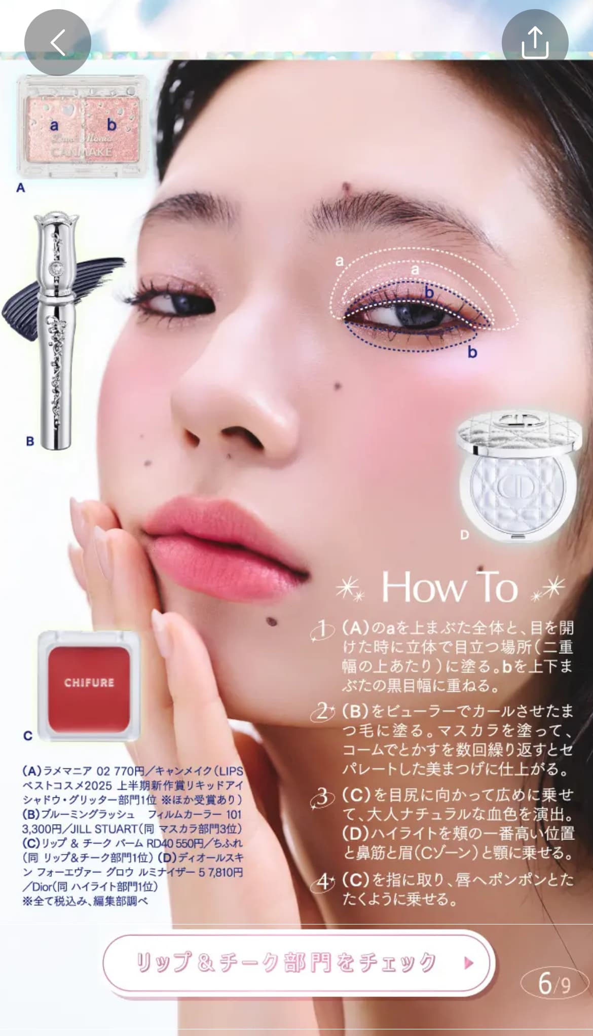 使用したLIPSベストコスメ2025年上半期受賞コスメの詳細情報と、使用方法まで細かく解説されています。有名美容雑誌のように作り込まれたビジュアルや、情報量の多さに驚きました。
