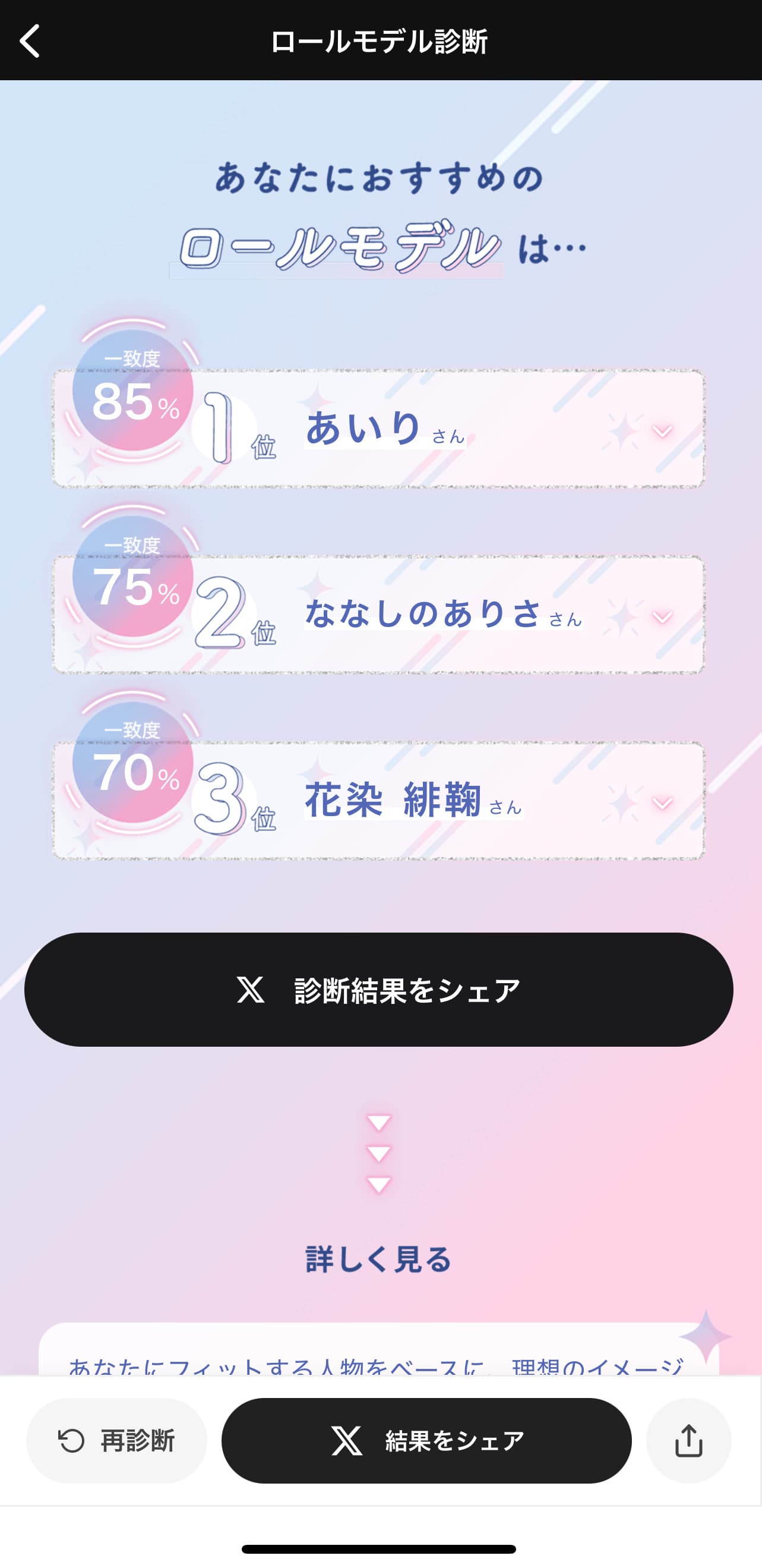 ロールモデル診断の結果が1位〜3位まで表示され、現時点で一致しているスペック(ブルベ夏、フェミニン、骨格ストレート)などが確認できます。